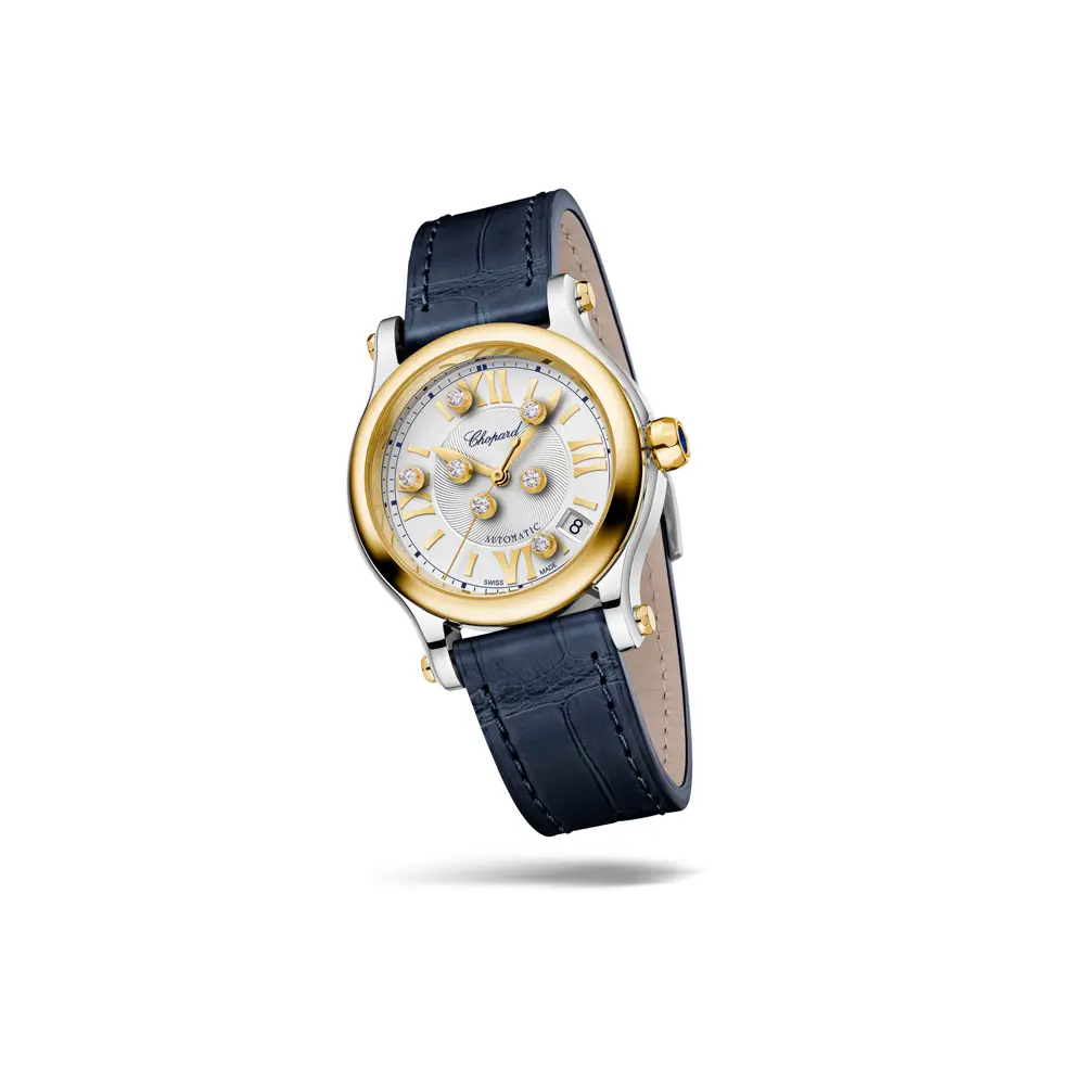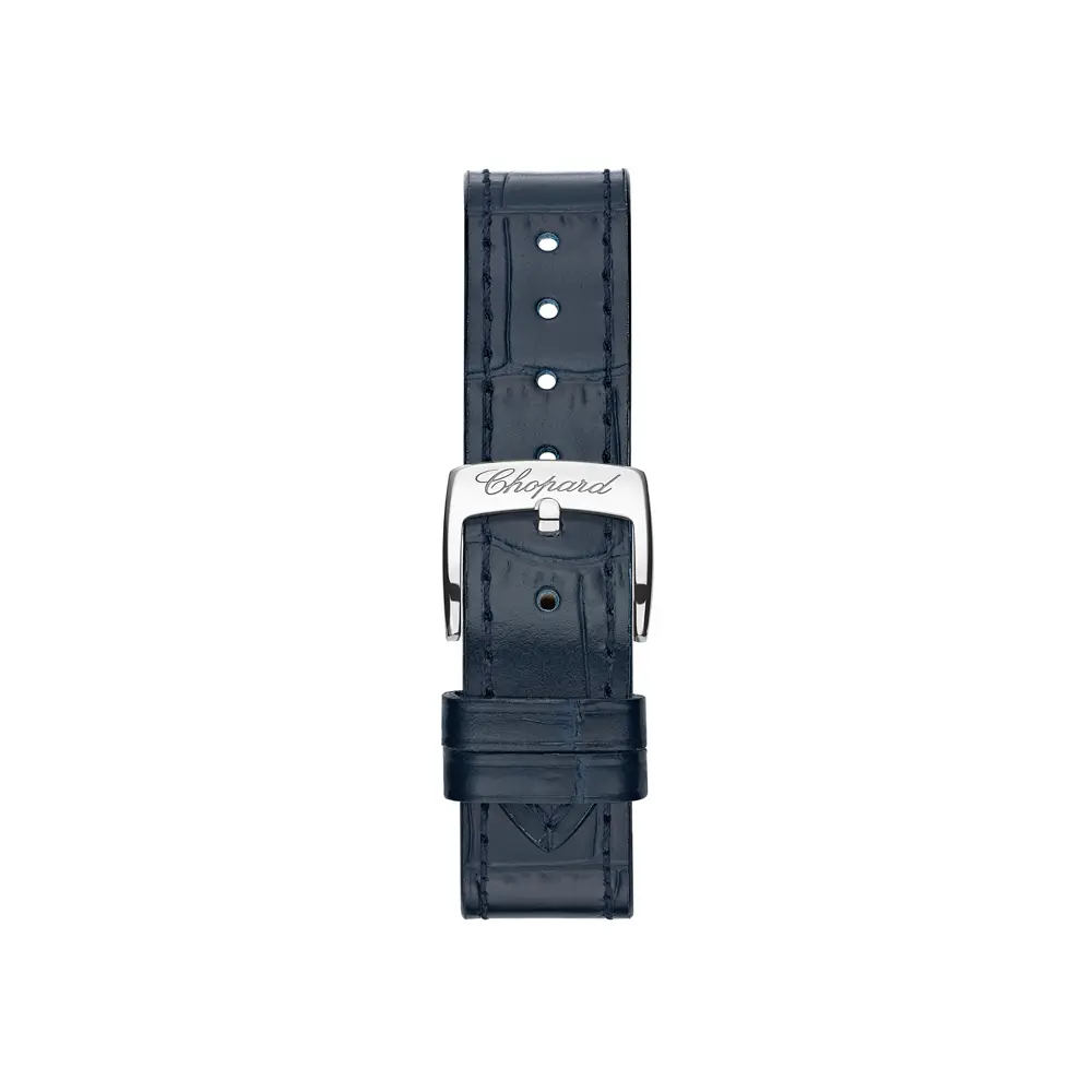 Im Inneren der Uhr arbeitet ein Automatikwerk mit einer Gangreserve von bis zu 62 Stunden, das für seine Zuverlässigkeit und Präzision bekannt ist. Das Modell ist mit einem blauen Alligatorlederarmband mit klassischer Dornschließe ausgestattet und bis zu 30 Meter wasserdicht. Die Chopard Happy Sport in dieser Ausführung ist Ausdruck von Freiheit, Verspieltheit und außergewöhnlichem Stil - die ideale Wahl für Frauen mit Sinn für Schönheit und technische Perfektion.