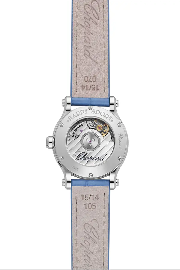 Im Inneren arbeitet ein Schweizer Automatikuhrwerk, das für höchste Präzision und Langlebigkeit steht – ein Zeichen für die meisterhafte Uhrmacherkunst von Chopard.