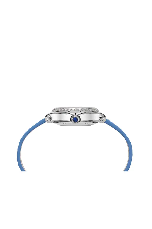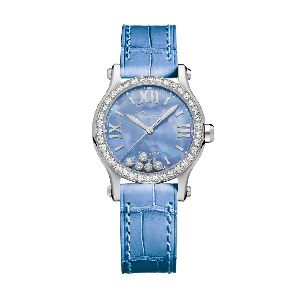 Das runde 30-mm-Gehäuse besteht aus poliertem Edelstahl und wird durch eine mit Diamanten besetzte Lünette gekrönt, die für glamourösen Glanz sorgt. Saphirglas schützt das edle blaue Zifferblatt mit Diamanten, auf dem die typischen beweglichen Diamanten frei zwischen zwei Gläsern tanzen – ein faszinierendes Spiel aus Licht und Bewegung bei jeder Handbewegung.