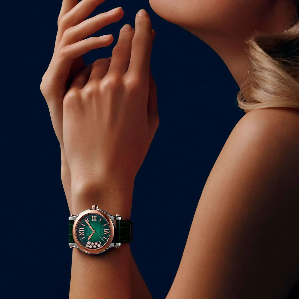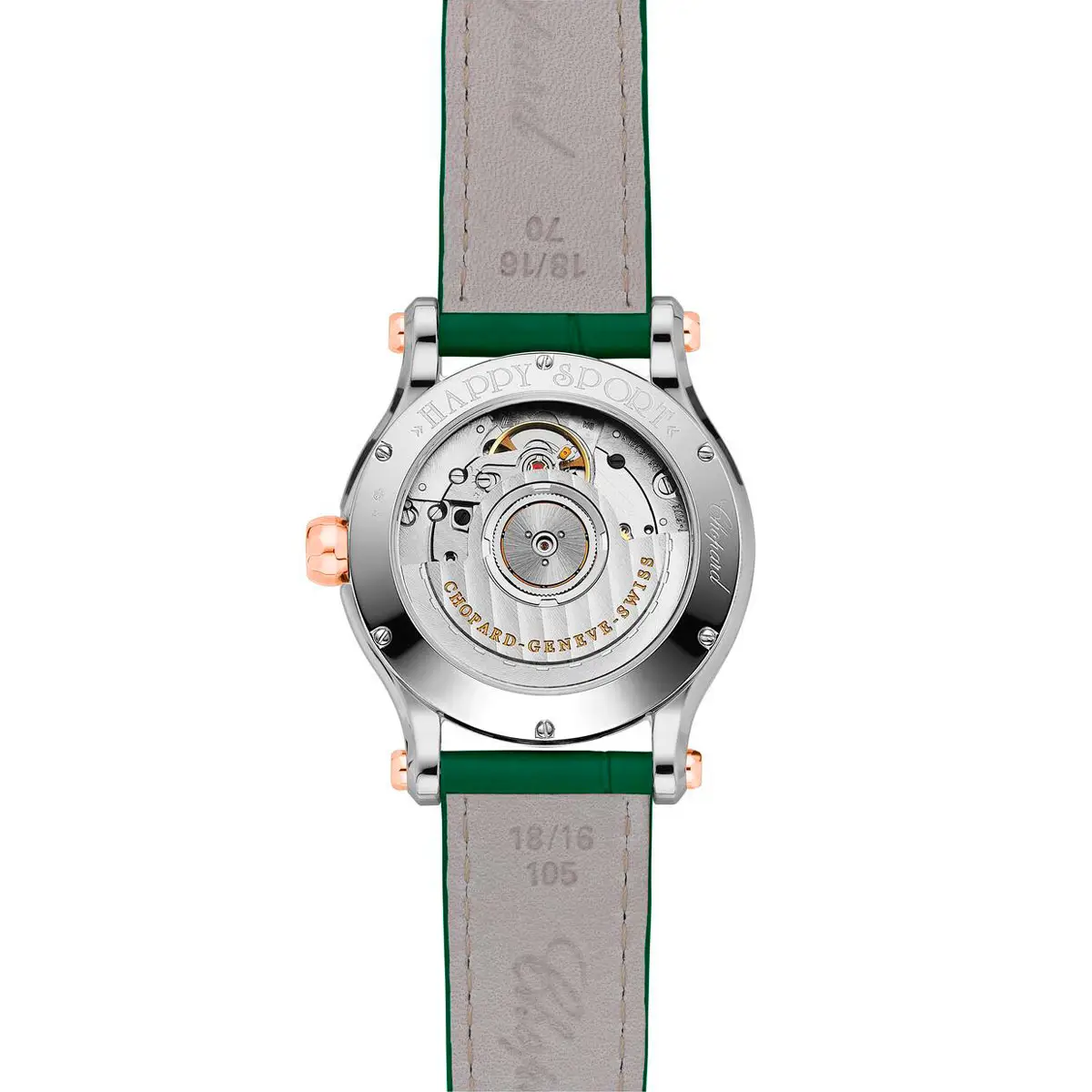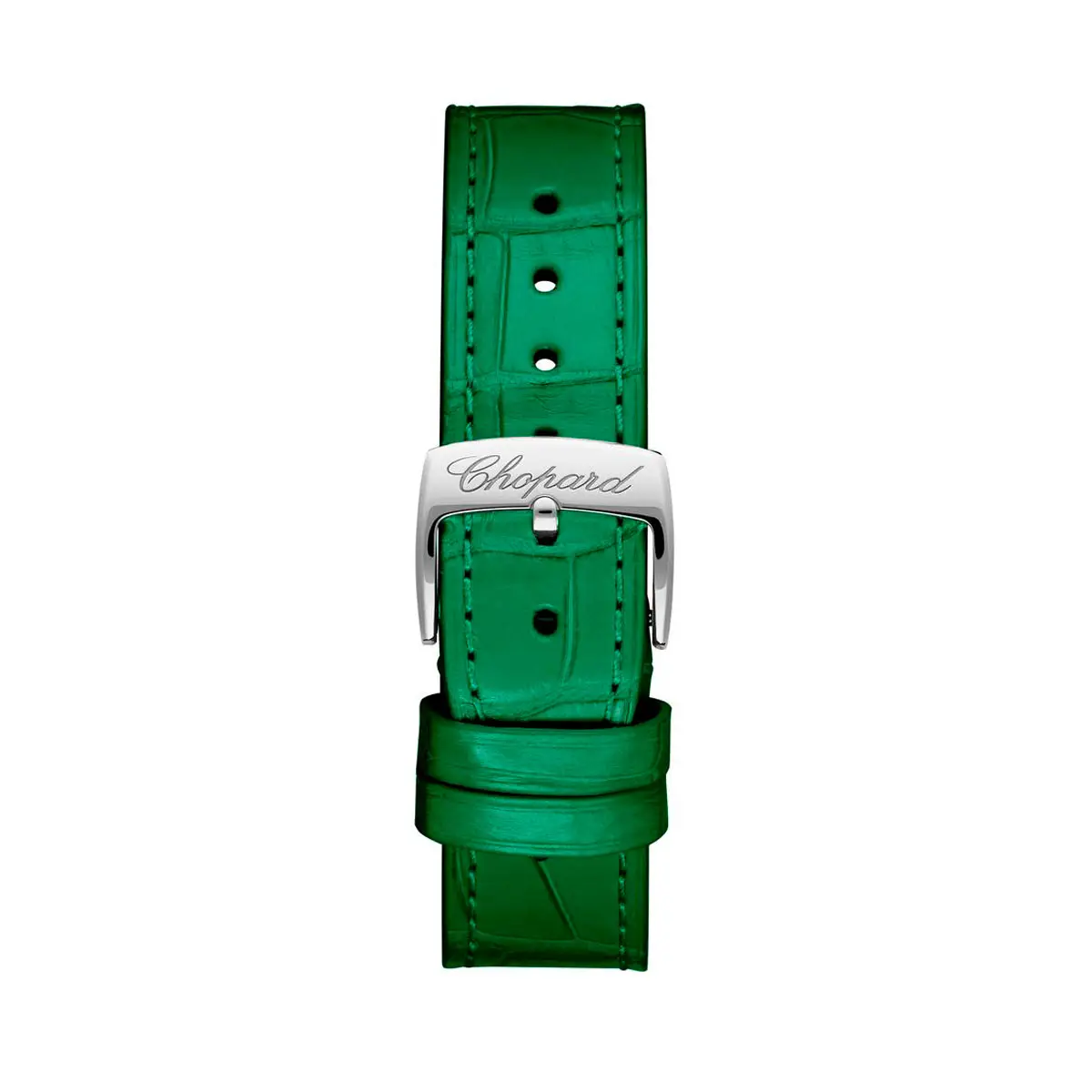 Der grüne, mit Diamanten besetzte Zifferblatt wird von frei beweglichen Diamanten geschmückt – ein Markenzeichen der Happy Sport-Kollektion, das jedem Handgelenk Glanz verleiht. Ergänzt wird das Design durch ein grünes Alligatorlederarmband, das mit einer Dornschließe ausgestattet ist.