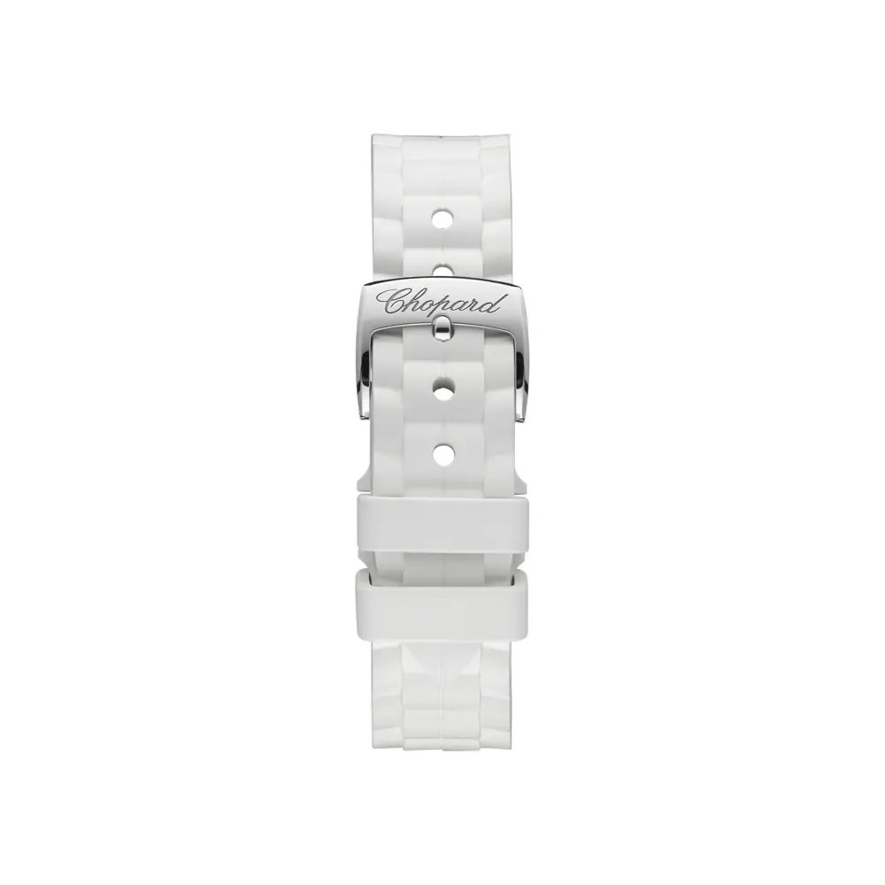 Der weiße Kautschukarmband betont den sportlich-eleganten Charakter der Uhr und sorgt für höchsten Tragekomfort. Im Inneren arbeitet ein schweizerisches Quarzwerk, das höchste Präzision und Zuverlässigkeit garantiert – ganz ohne Aufzug. Die Chopard Happy Sport 278582-3001 ist mehr als nur eine Uhr – sie ist ein Ausdruck von Weiblichkeit, Lebensfreude und modernem Stil, ganz im Geiste von Chopard.