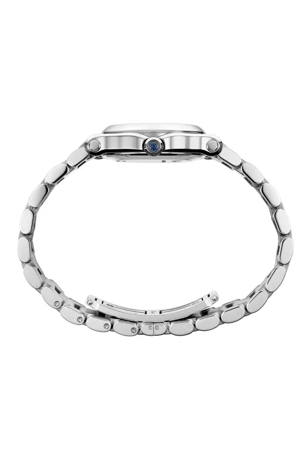 Ein Saphirglas schützt das Zifferblatt zuverlässig vor Kratzern. Das silberfarbene Edelstahlarmband mit Faltschließe fügt sich harmonisch in das edle Design ein.
