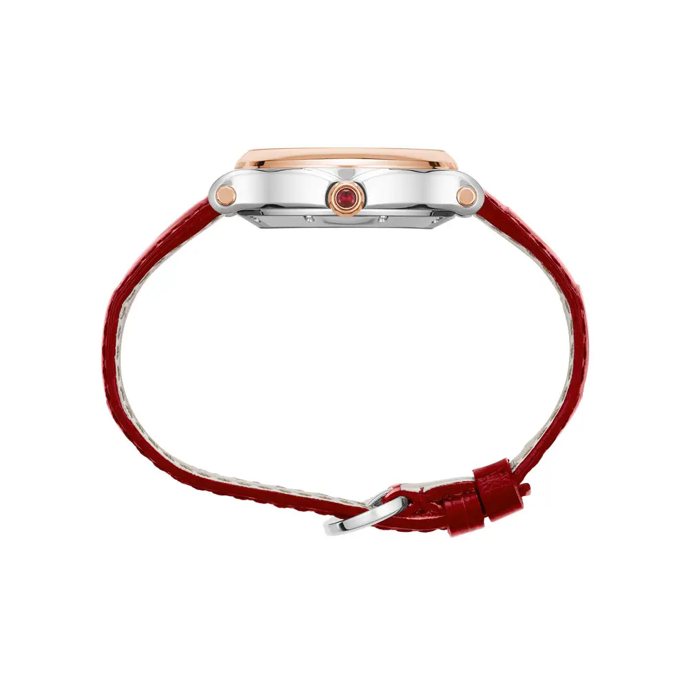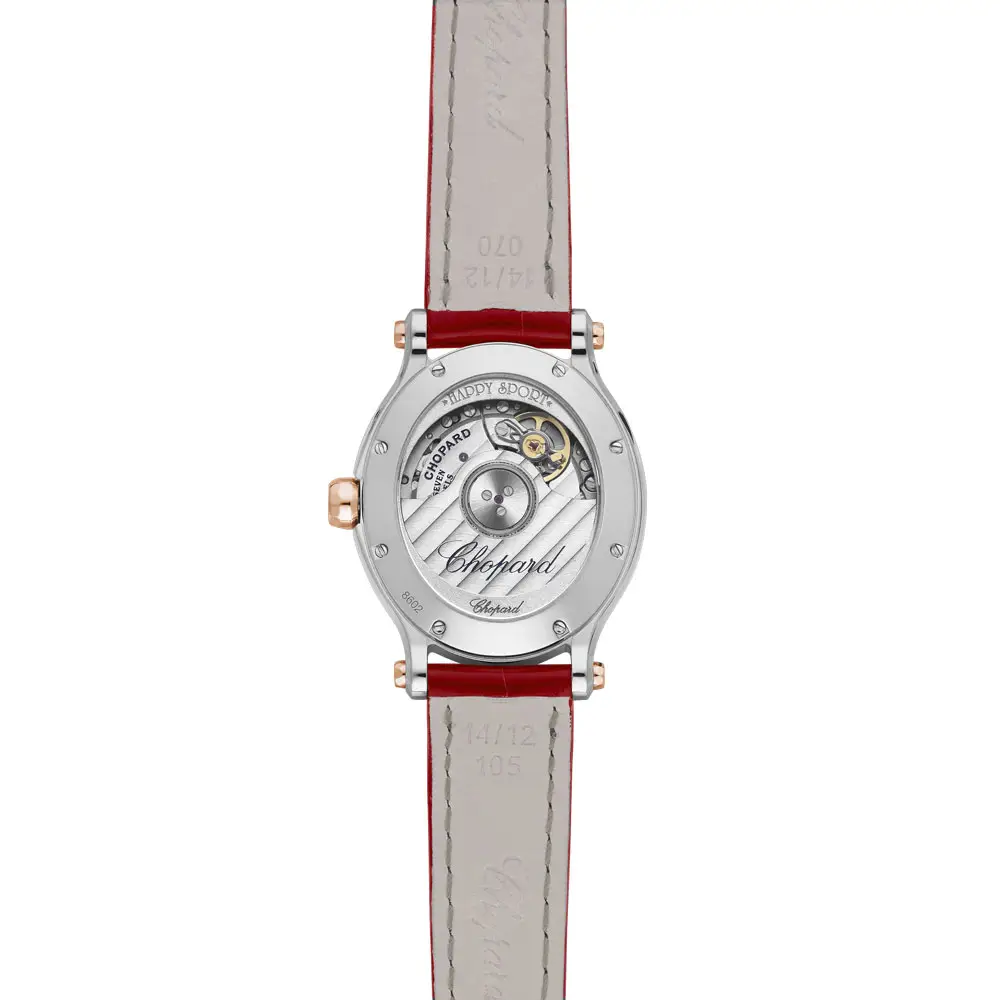 Die Chopard Happy Sport 278602-6006 verkörpert feminine Anmut in einem eleganten Burgunderton. Ihr rundes , ovales Gehäuse mit den Maßen 29 x 31 mm aus Edelstahl und 18-karätigem Roségold wirkt zart und luxuriös zugleich. Auffallend ist das tief burgunderfarbene Zifferblatt, auf dem sieben Diamanten tanzen - ein verspieltes Detail, das für die gesamte Happy Sport-Kollektion charakteristisch ist.