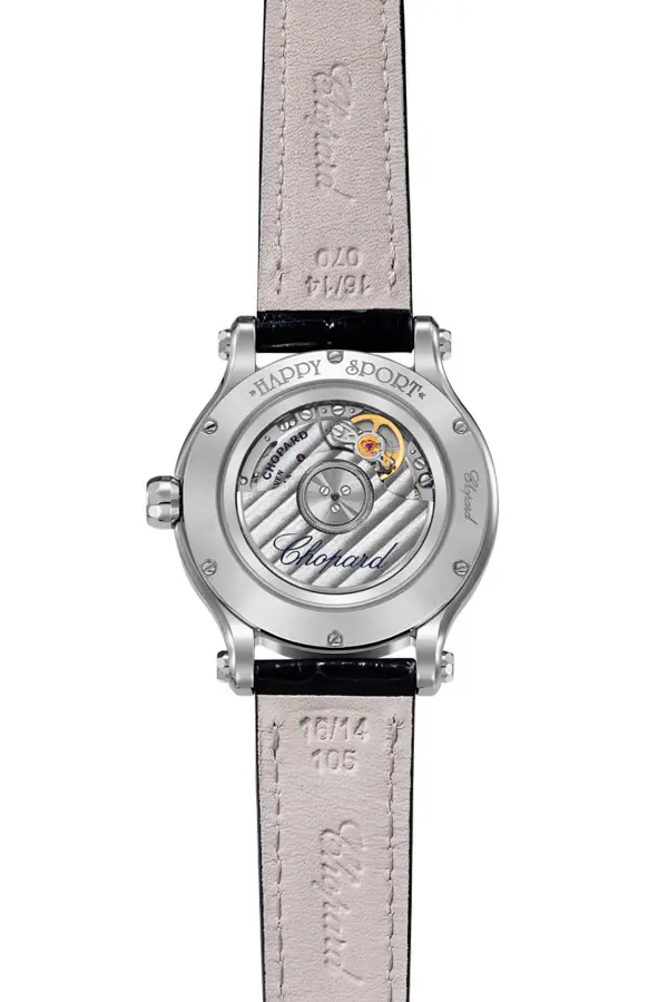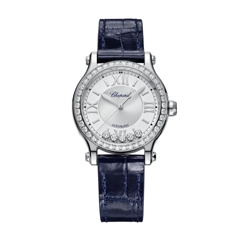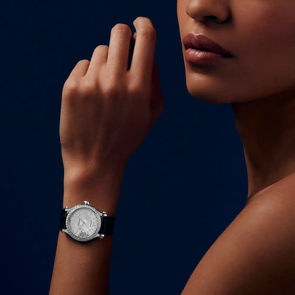 Unter dem kratzfesten Saphirglas befindet sich ein weißes Zifferblatt mit silberfarbenen Zeigern und römischen Ziffern, das klassische Eleganz mit hervorragender Ablesbarkeit verbindet. Das Highlight bilden frei bewegliche Diamanten, die zwischen zwei Saphirgläsern tanzen – das ikonische Merkmal der Happy Sport Kollektion, Symbol für Bewegung, Freude und Licht.
