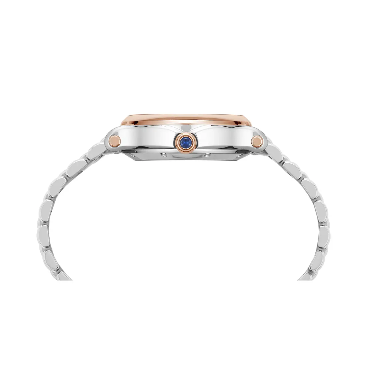 Das elegante ovale Gehäuse mit den Maßen 31,31 x 29 mm besteht aus poliertem Edelstahl, während die Lünette aus 18 Karat Roségold einen warmen, femininen Akzent setzt. Das Saphirglas schützt zuverlässig vor Kratzern und die Wasserdichtigkeit von 3ATM / 30M macht die Uhr alltagstauglich.