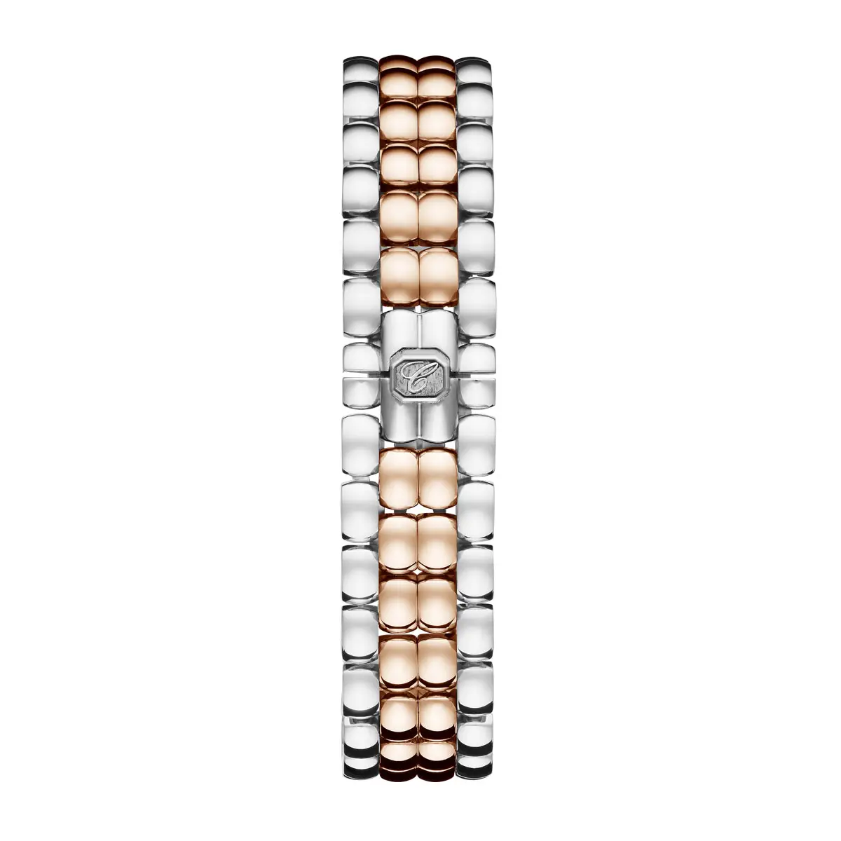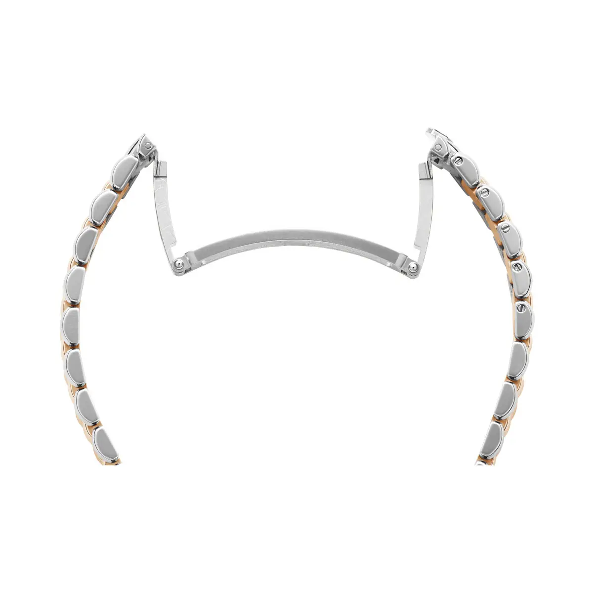 Das luxuriöse bicolor Armband aus Edelstahl und 18kt Roségold unterstreicht den edlen Charakter der Uhr und verleiht ihr eine moderne, zeitlose Ästhetik. Die Faltschließe sorgt für sicheren Tragekomfort und ein harmonisches Gesamtbild.