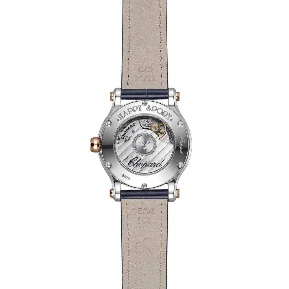 Der blaue Alligatorlederarmband mit klassischer Dornschließe rundet das Design harmonisch ab. Im Inneren arbeitet ein schweizerisches Automatikwerk, das Präzision und Zuverlässigkeit garantiert. Die Chopard Happy Sport Sun, Moon and Stars 278573-6027 ist mehr als nur eine Uhr – sie ist ein himmlisches Schmuckstück, das Weiblichkeit, Licht und grenzenlose Eleganz symbolisiert.