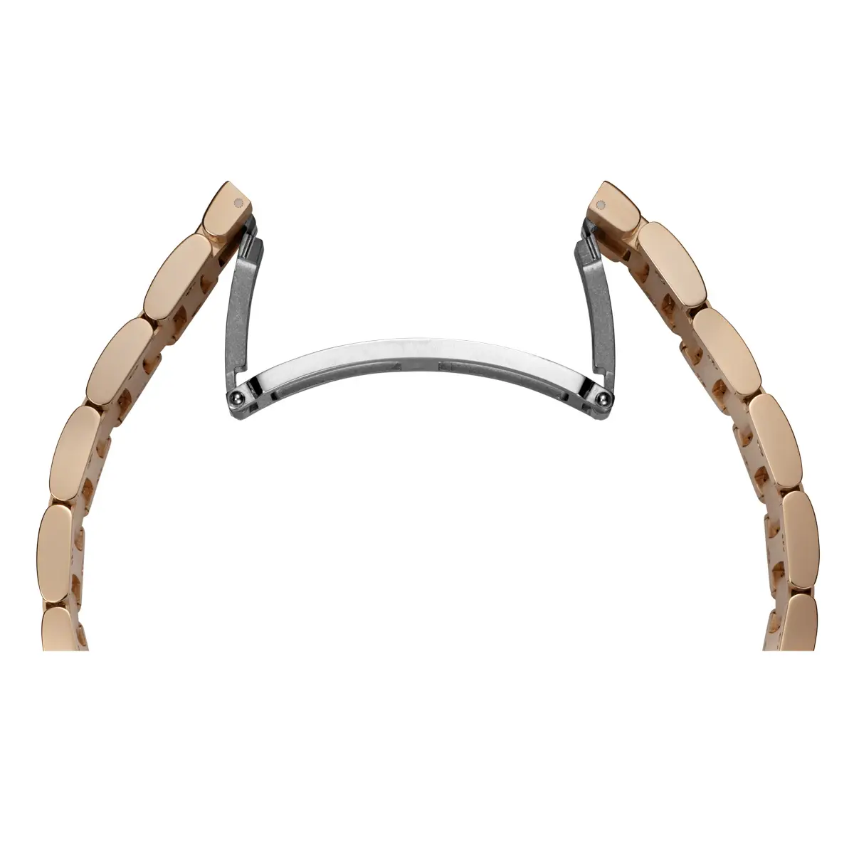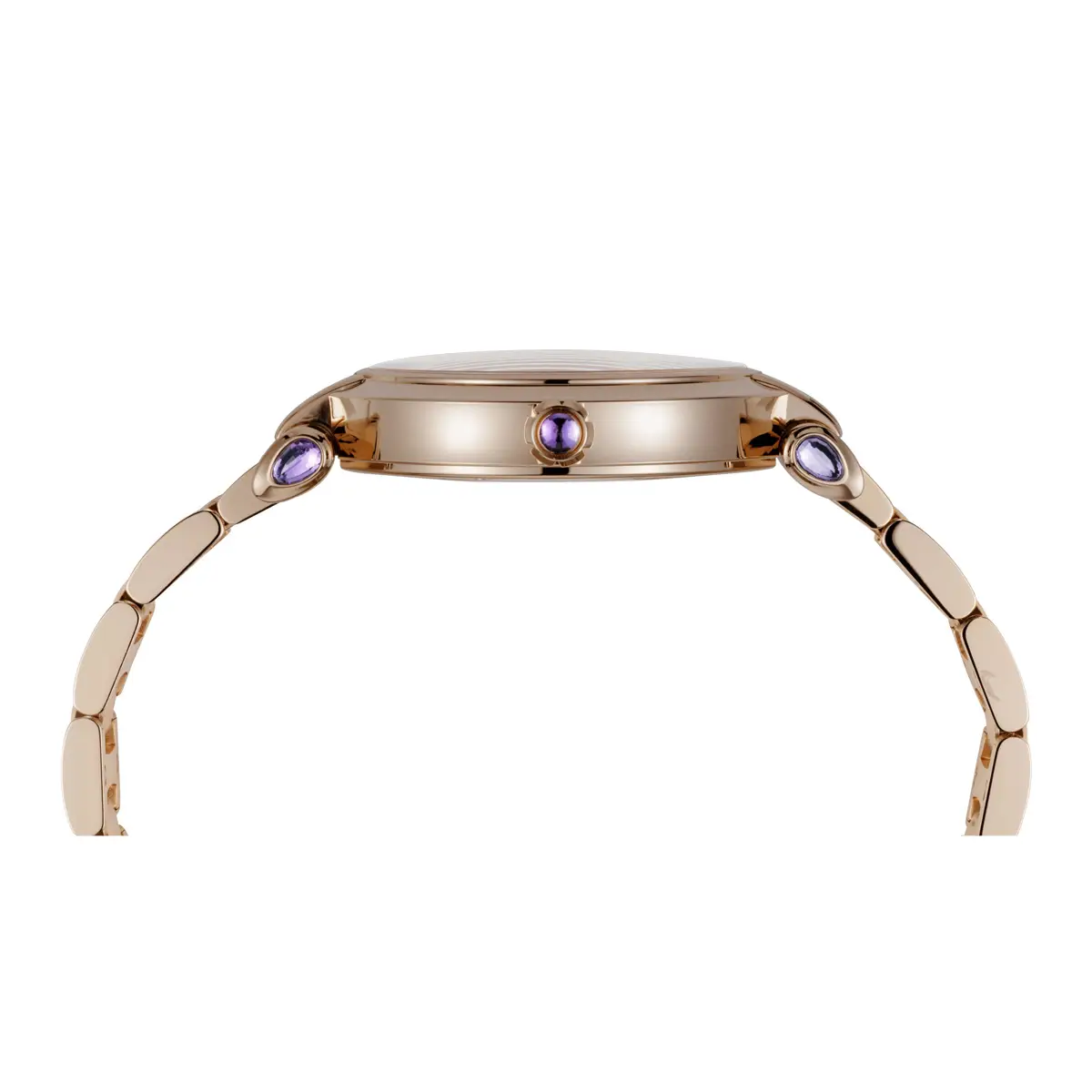 Das runde 36-mm-Gehäuse besteht vollständig aus 18-karätigem Roségold und strahlt einen warmen, edlen Glanz aus. Das Perlmuttzifferblatt, geschützt durch Saphirglas, zeigt feine Reflexe und Details, die an antike kaiserliche Symbole erinnern. Fein geformte Zeiger und Indizes schaffen ein harmonisches Gesamtbild, während die Wasserdichtigkeit bis 30 m (3 ATM) den Alltagseinsatz ermöglicht.
