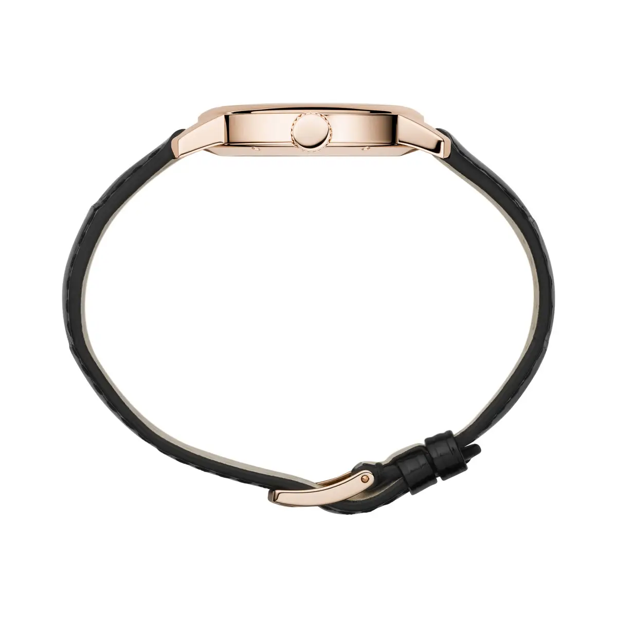 Ein schwarzes Alligatorlederarmband mit klassischer Dornschließe rundet das Design stilvoll ab. Der Kontrast zwischen dem dunklen Band und dem Roségoldgehäuse sorgt für eine harmonische, elegante Optik.
