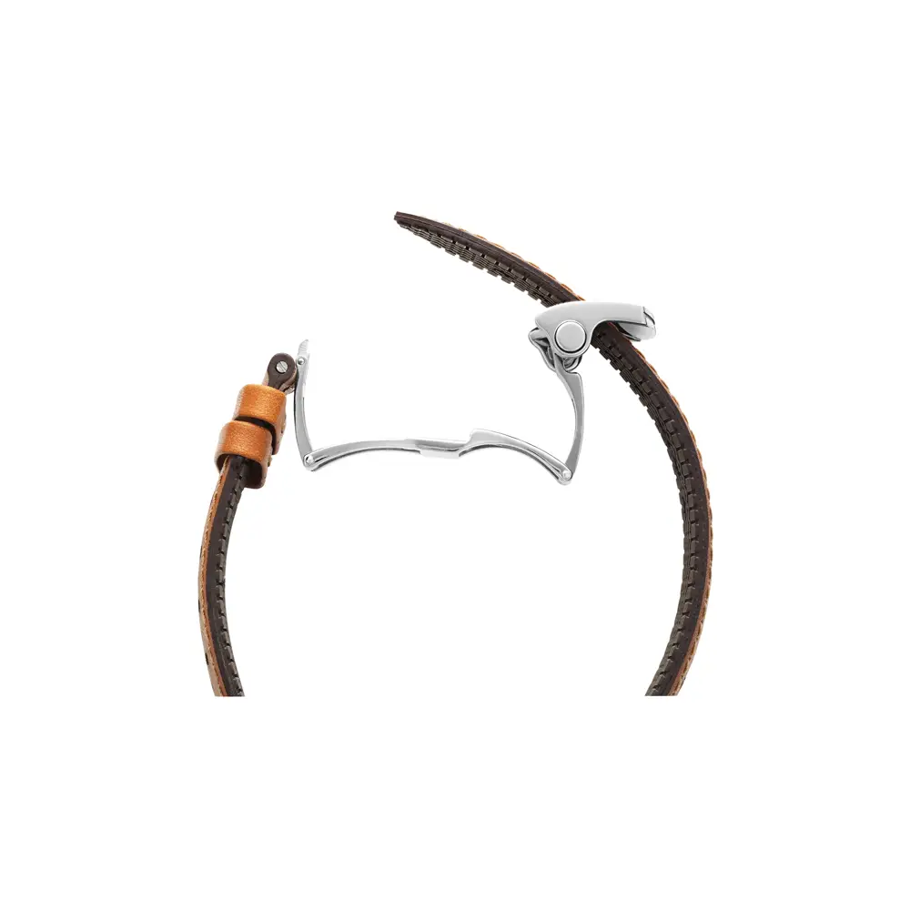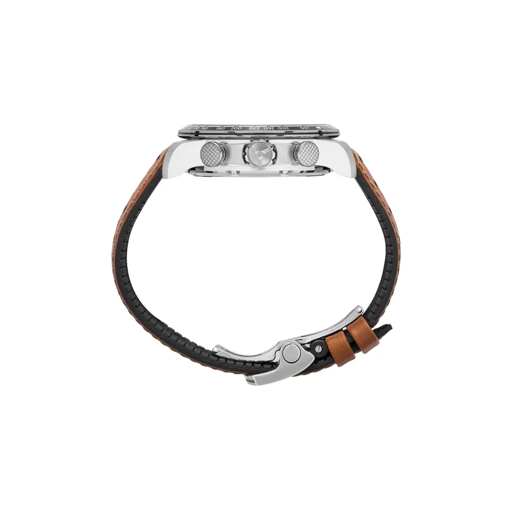 Ein braunes Lederarmband mit Dornschließe erinnert an klassische Autositze. Mit einer Wasserdichtigkeit von 10 ATM (100 Meter) ist diese Uhr bereit für jedes Abenteuer.