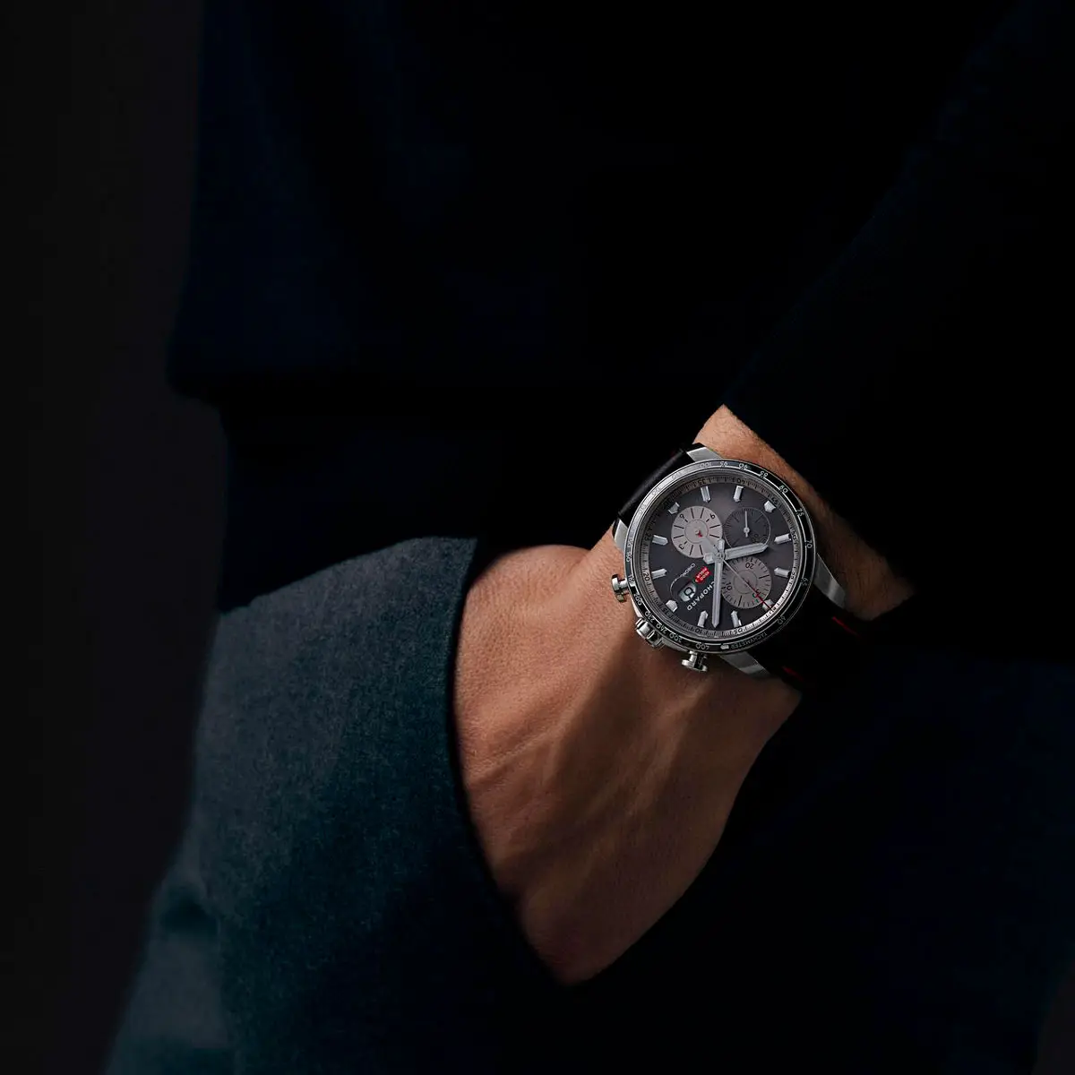 Das 44-mm-Edelstahlgehäuse wird von einer Lünette aus Stahl und Aluminium ergänzt, die den dynamischen Charakter des Modells unterstreicht. Das graue Zifferblatt mit roten Akzenten, inspiriert vom Rennsport, wird durch entspiegeltes Saphirglas geschützt. Mit Chronograph, Datumsanzeige und leuchtenden Zeigern bietet die Uhr hervorragende Ablesbarkeit.