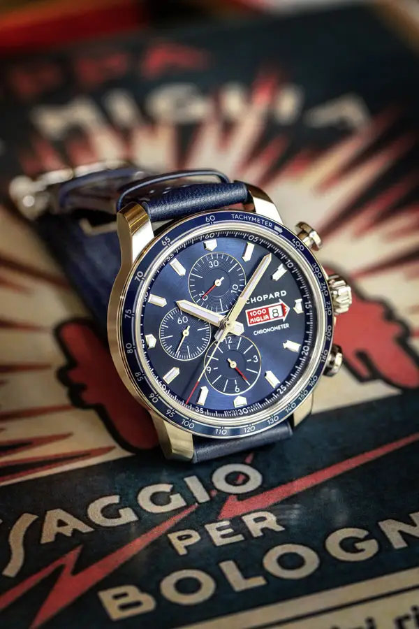 Die Mille-Miglia-Uhren vereinen die Ästhetik klassischer Autos und hohe Uhrmachertechnik. Das Design bezieht sich oft auf Details wie die Instrumente an Bord, Zifferblätter, die an Tachometer erinnern, oder Armbänder, die von Dunlop-Reifen aus den 1960er Jahren inspiriert sind.