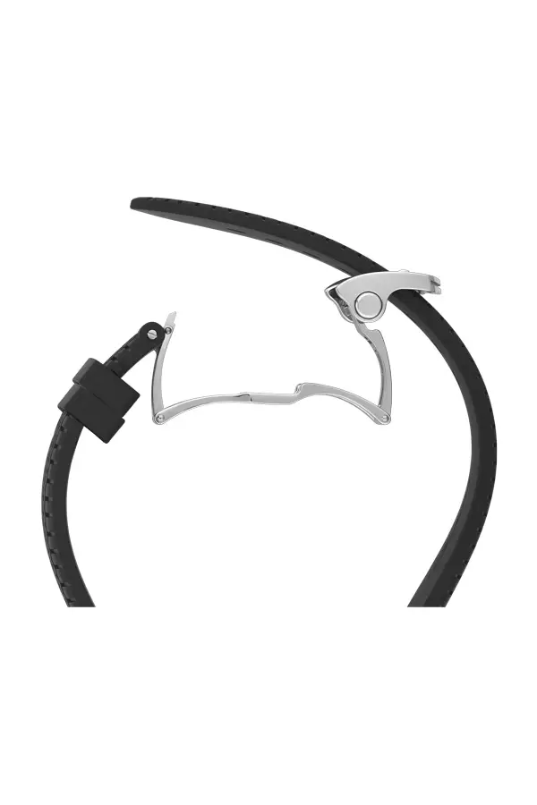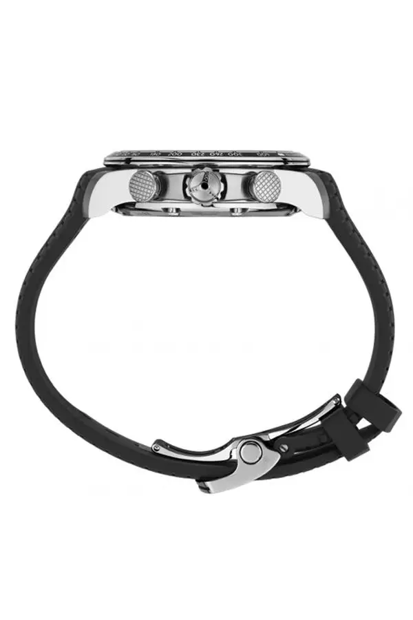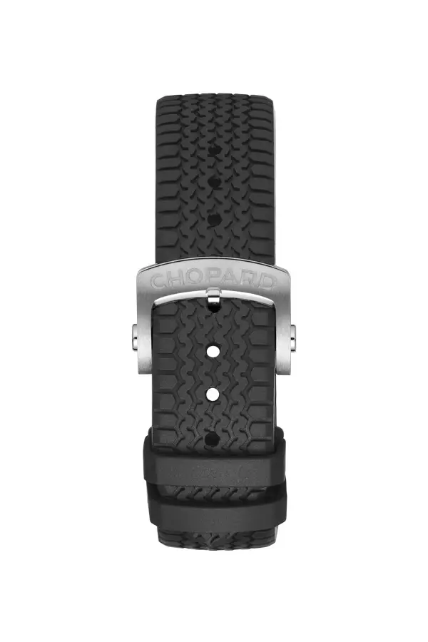 Das Modell ist mit einem schwarzen Kautschukarmband mit einem von Dunlop-Reifen inspirierten Profil und einer Faltschließe ausgestattet – bequem und sicher.