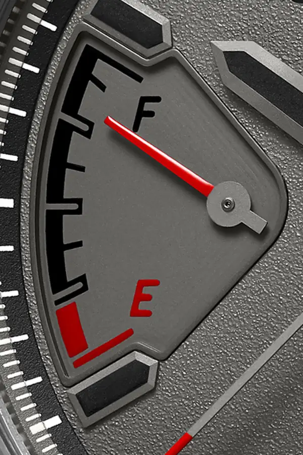 Das schwarze Zifferblatt mit Gangreserveanzeige erinnert an ein klassisches Armaturenbrett, geschützt durch entspiegeltes Saphirglas.