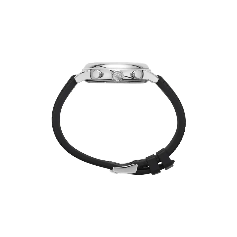 Das schwarze Kautschukarmband mit dem Profil klassischer Dunlop-Reifen verleiht der Uhr sportlichen Stil und angenehmen Tragekomfort. Eine Dornschließe sorgt für sicheren Halt.