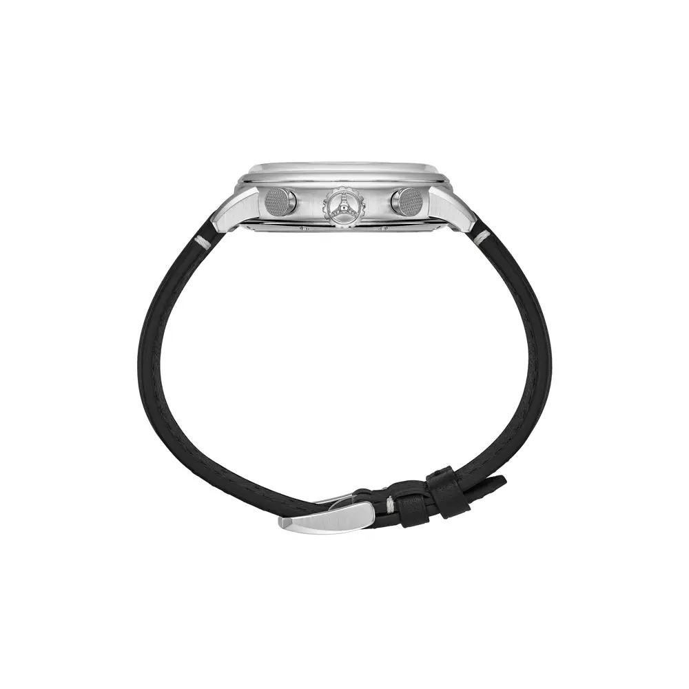 Das Modell ist mit einem schwarzen Lederarmband und klassischer Dornschließe ausgestattet – für sicheren und angenehmen Tragekomfort. Eine schlichte Edelstahl-Lünette ergänzt das sportlich-maskuline Design.