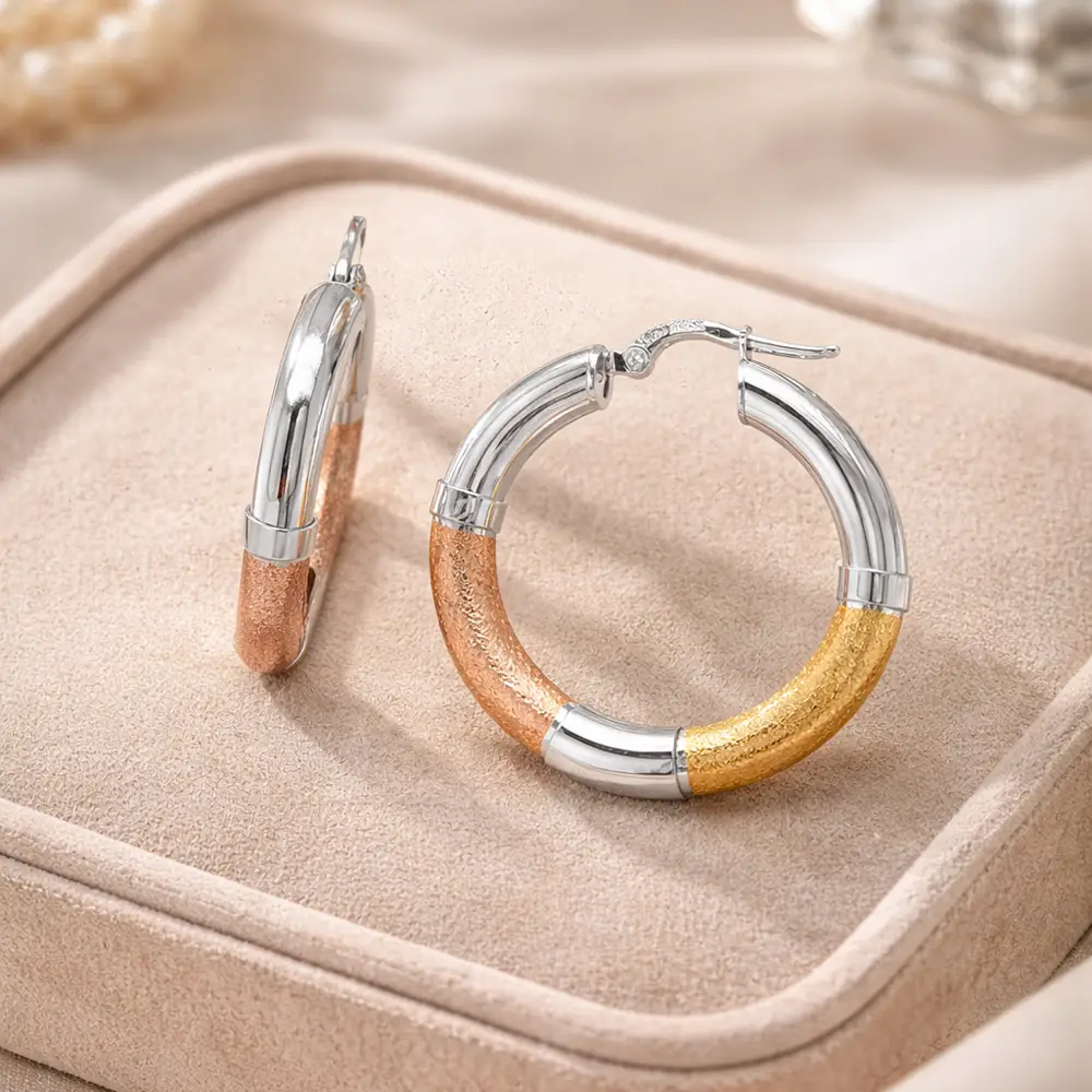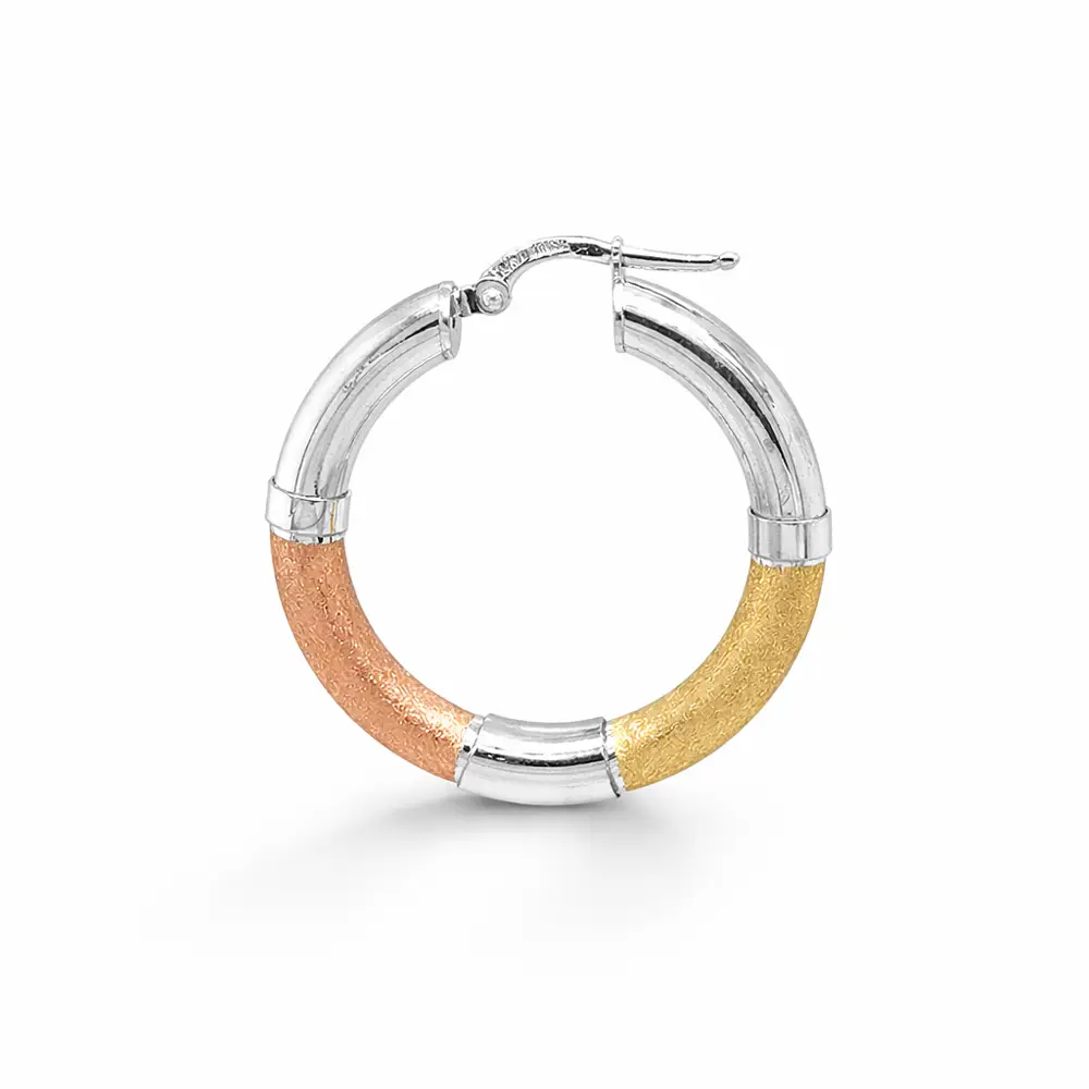 Diese Creolen aus dreifarbigem Gold überzeugen durch die elegante Kombination aus Weiß-, Gelb- und Roségold, die einen harmonischen und zeitlosen Eindruck vermittelt. Die fein strukturierte Oberfläche der einzelnen Segmente verleiht dem Schmuckstück Tiefe und einen edlen Charakter, während die klassische Kreisform ausgewogen und elegant wirkt.