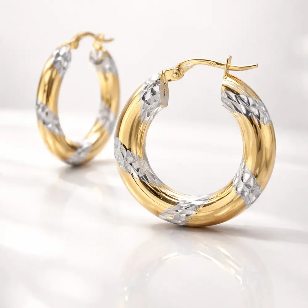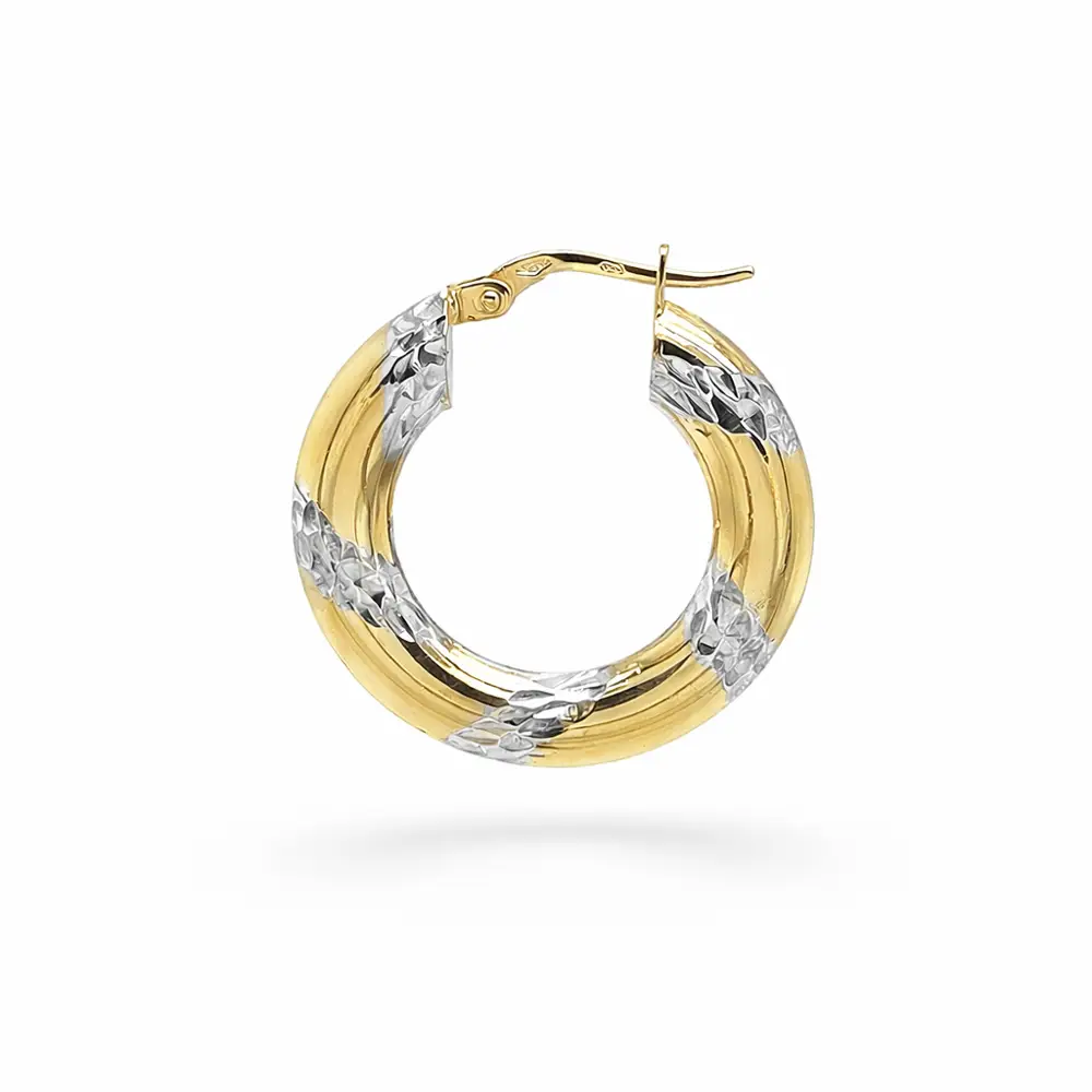 Diese Creolen aus kombiniertem Gold überzeugen durch das harmonische Zusammenspiel von Gelb- und Weißgoldtönen, ergänzt durch feine gravierte Details. Die präzise ausgearbeitete Oberfläche schafft einen eleganten Kontrast zwischen glatten und strukturierten Flächen und verleiht dem Schmuckstück eine dynamische, luxuriöse und zeitlose Ausstrahlung.