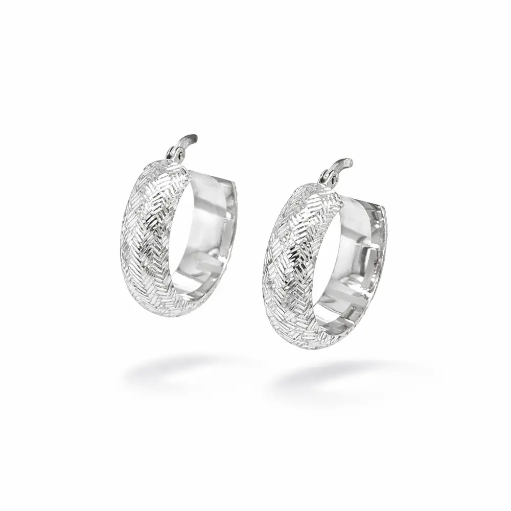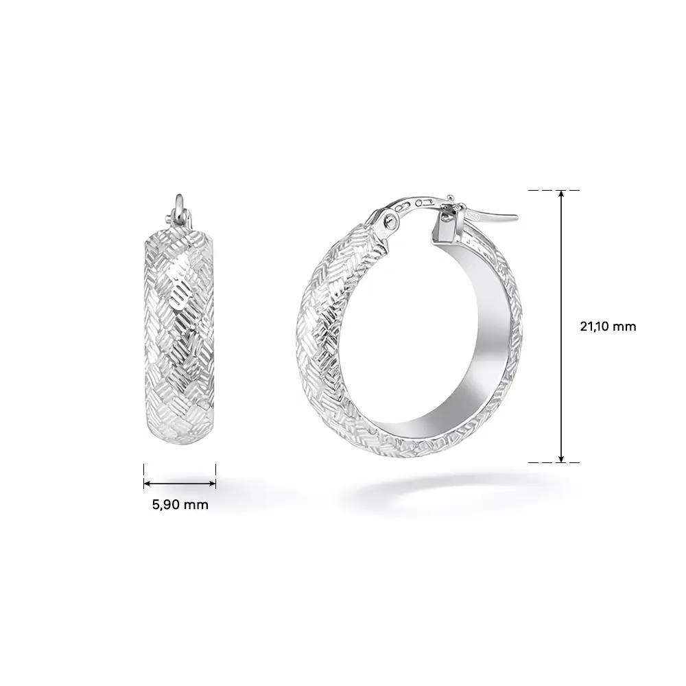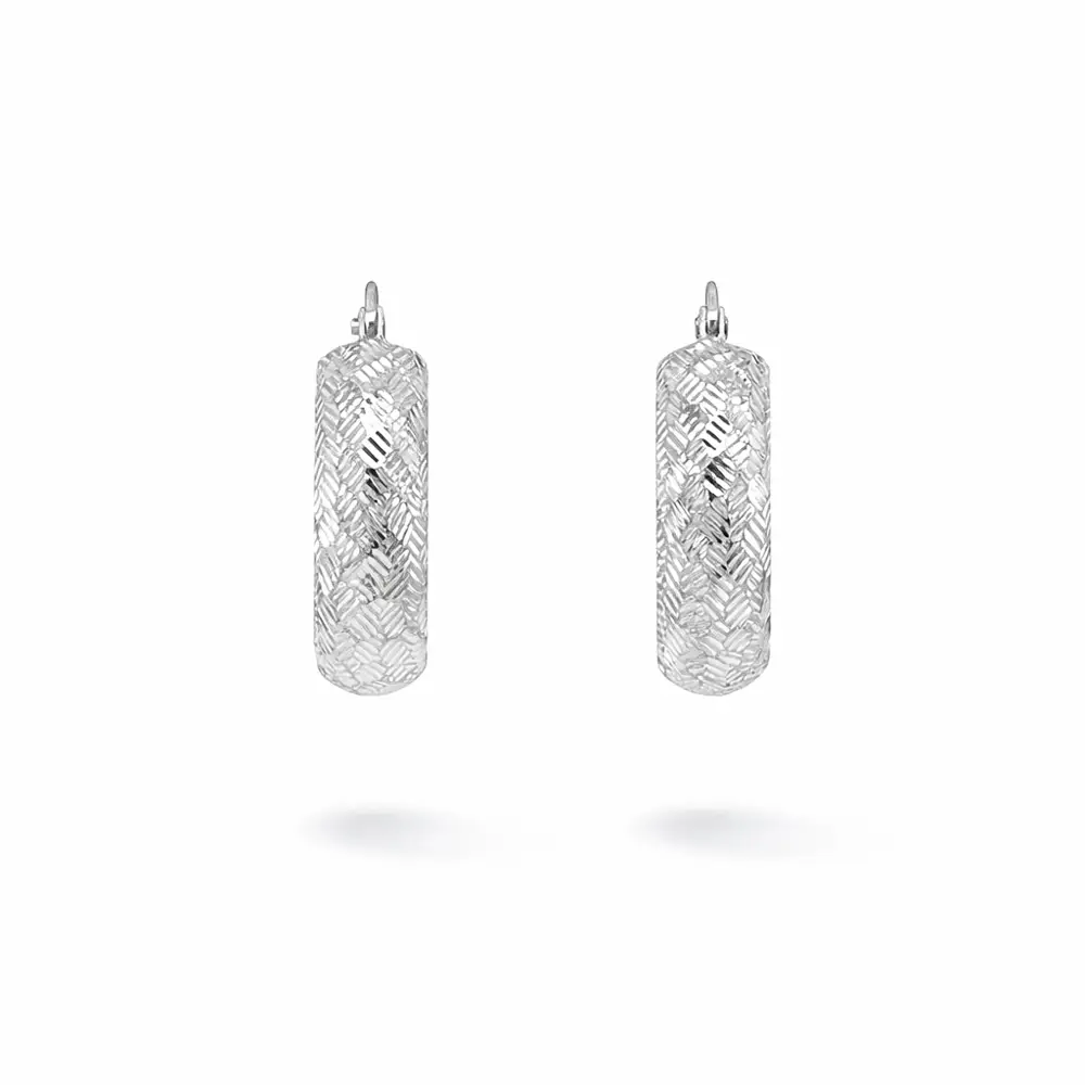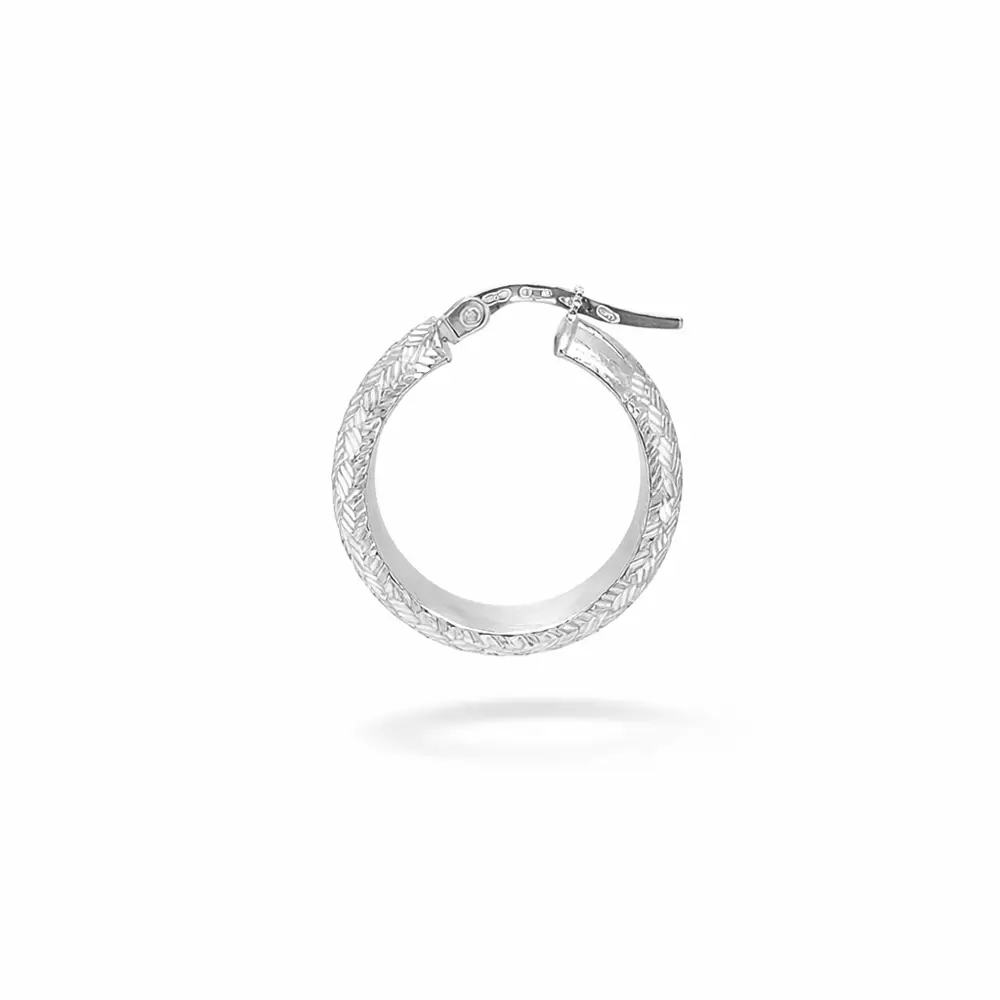 Diese Creolen aus Weißgold überzeugen durch ihre markante gravierte Oberfläche, die ein faszinierendes Lichtspiel erzeugt und dem Schmuckstück eine elegante, fein strukturierte Optik verleiht. Das präzise ausgeführte Muster unterstreicht den luxuriösen Charakter der Ohrringe und macht sie zu einem zeitlosen Accessoire.