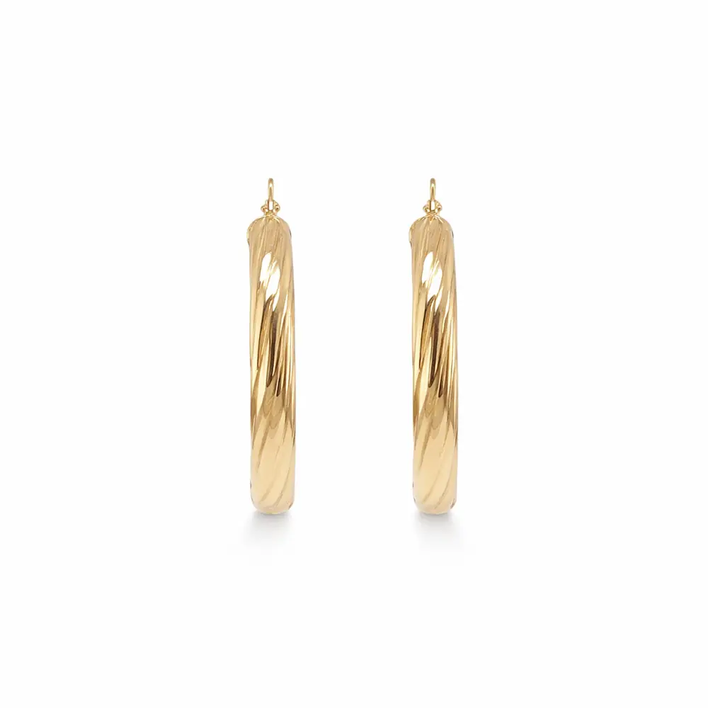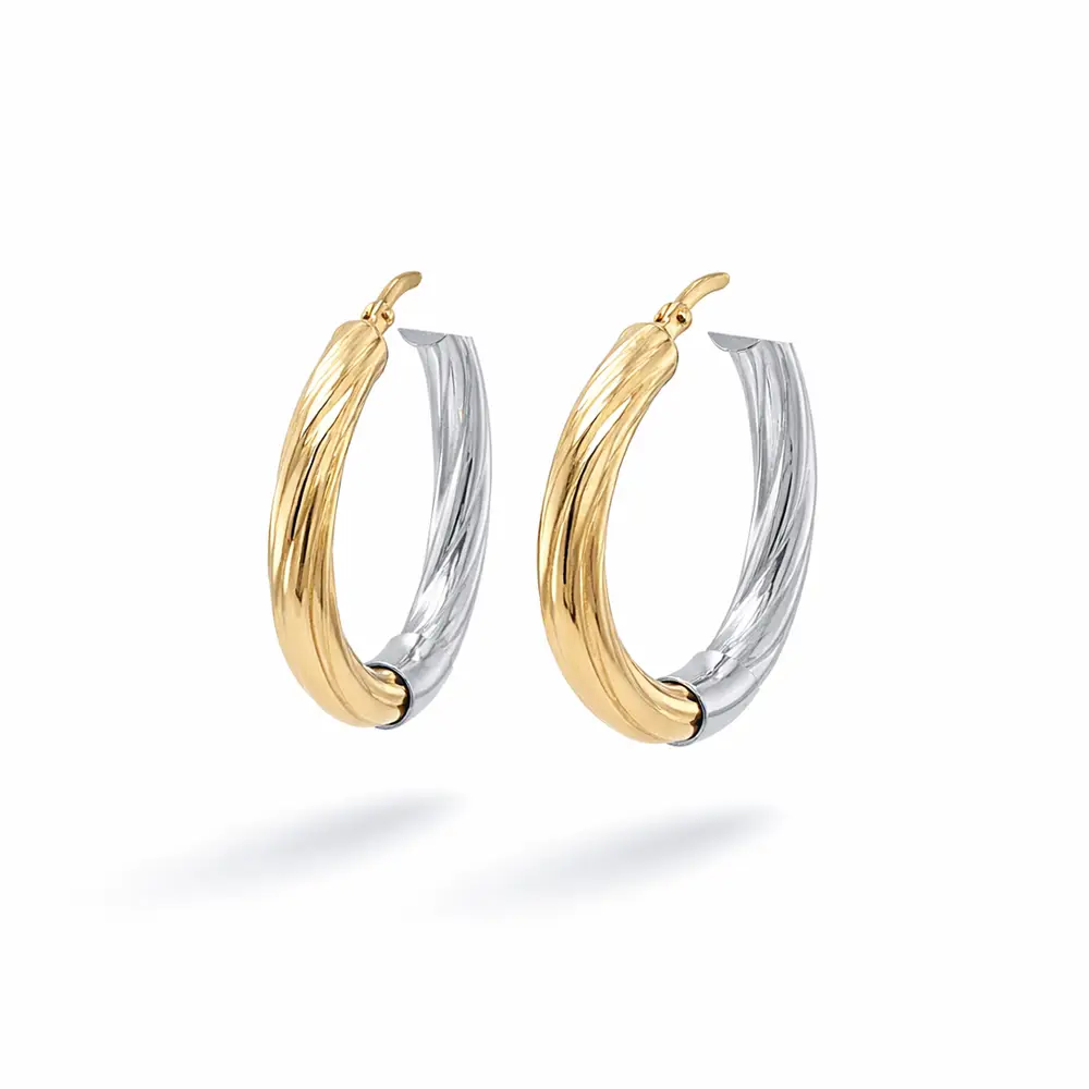 Diese Creolen aus zweifarbigem Gold überzeugen durch den eleganten Kontrast von Gelb- und Weißgold, der ihnen ein zeitloses und zugleich ausdrucksstarkes Design verleiht. Die sanft geformte Oberfläche reflektiert das Licht besonders schön.