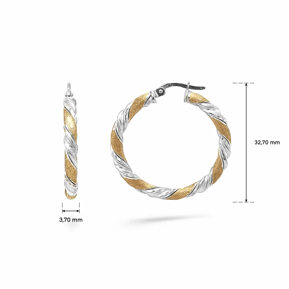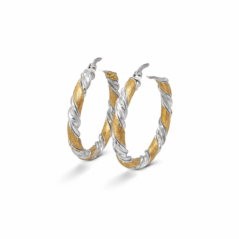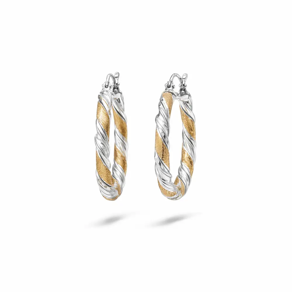 Diese Creolen aus zweifarbigem Gold überzeugen durch ihr elegantes spiralförmiges Design, das glatt poliertes Weißgold mit fein strukturierter Gelbgold-Oberfläche kombiniert. Der Kontrast der Oberflächen verleiht den Ohrringen einen modernen und zugleich zeitlosen Charakter.