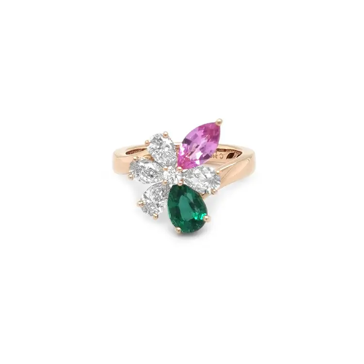 Im Zentrum steht ein natürlicher grüner Smaragd, 0,82 ct, Birnenschliff (7,00 × 5,00 mm), ergänzt durch einen natürlichen rosafarbenen Saphir, 0,68 ct, im eleganten Marquiseschliff (8,40 × 4,40 mm). Ihre kontrastierenden Töne werden durch ein Diamant-Ensemble hervorgehoben: vier natürliche weiße Diamanten im Birnenschliff, gesamt 1,19 ct (4,65 × 3,50 mm), Reinheit VS, Farbe F, plus ein runder Diamant 0,06 ct (Ø 2,00 mm), Reinheit VS2, Farbe F. Das Ergebnis ist ein Schmuckstück, das durch Farbigkeit, Originalität und luxuriösen Charakter besticht.
