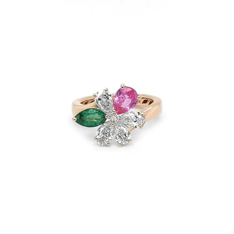 Die Hauptrolle spielen zwei Farbedelsteine – ein natürlicher rosafarbener Saphir, 0,90 ct, Birnenschliff (6,00 × 5,00 mm) und ein natürlicher grüner Smaragd, 0,43 ct, ebenfalls Birnenschliff (6,90 × 4,20 mm). Ihre kontrastierenden Töne werden von vier natürlichen weißen Diamanten gesamt 1,21 ct, Birnenschliff (4,70 × 3,70 mm), Reinheit VS, Farbe F gerahmt und von einem runden Diamanten 0,06 ct (Ø 2,50 mm), ebenfalls VS/F ergänzt. Das Ergebnis ist ein Ring, der Verspieltheit, Luxus und originelle Eleganz vereint.