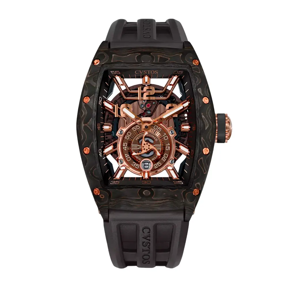 Die Cvstos Jetliner PS 5N Carbon / Oro Carbon vereint innovative Materialien, technische Präzision und moderne Eleganz. Das tonneauförmige Gehäuse (53,7 × 41 mm) besteht aus Kohlefaserverbund mit Akzenten aus 5N Roségold und verkörpert Leichtigkeit, Stabilität und luxuriösen Stil – inspiriert vom aeronautischen Design der Jetliner-Kollektion.