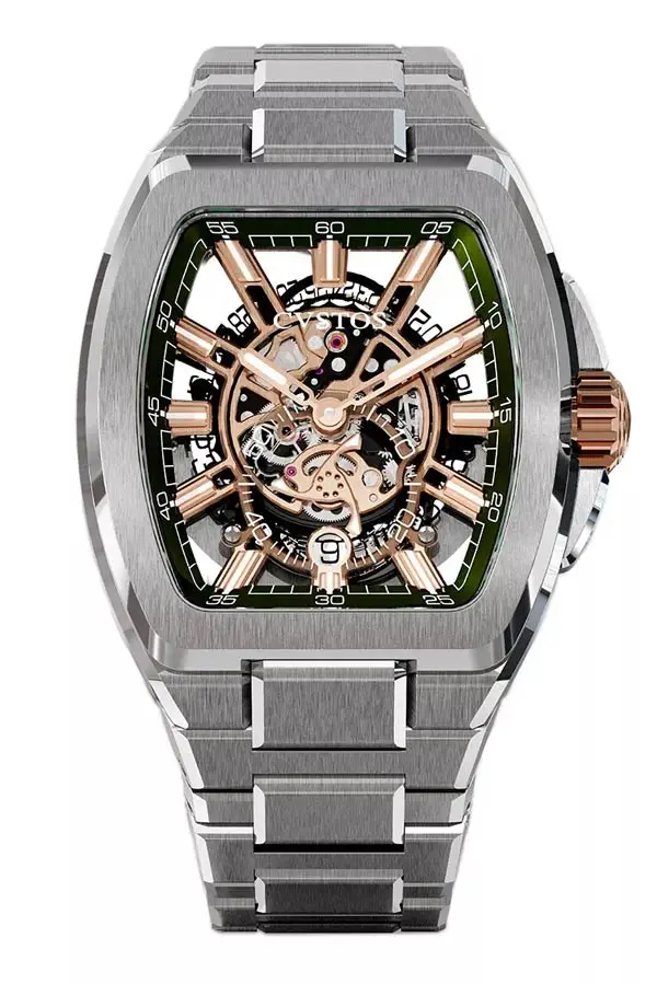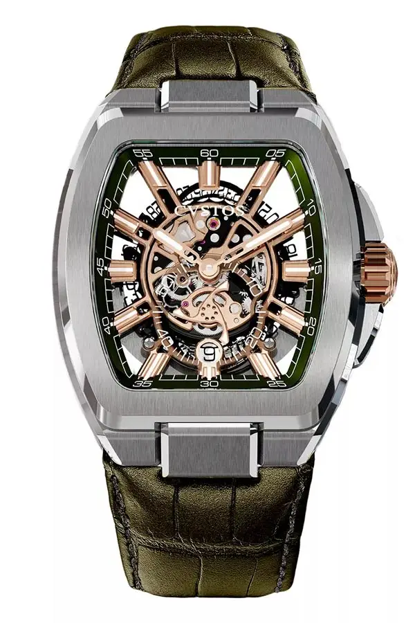 Das tonnenförmige Gehäuse aus Titan mit den Maßen 51 x 42 mm wirkt kraftvoll und ist dennoch angenehm leicht – Titan verleiht der Uhr Robustheit bei gleichzeitig hohem Tragekomfort. Das kratzfeste Saphirglas schützt das goldfarbene, skelettierte Zifferblatt, unter dem das Herz der Uhr schlägt: das Kaliber CVS410 SQLT mit automatischem Aufzug und einer Gangreserve von ca. 42 Stunden.