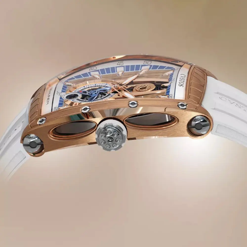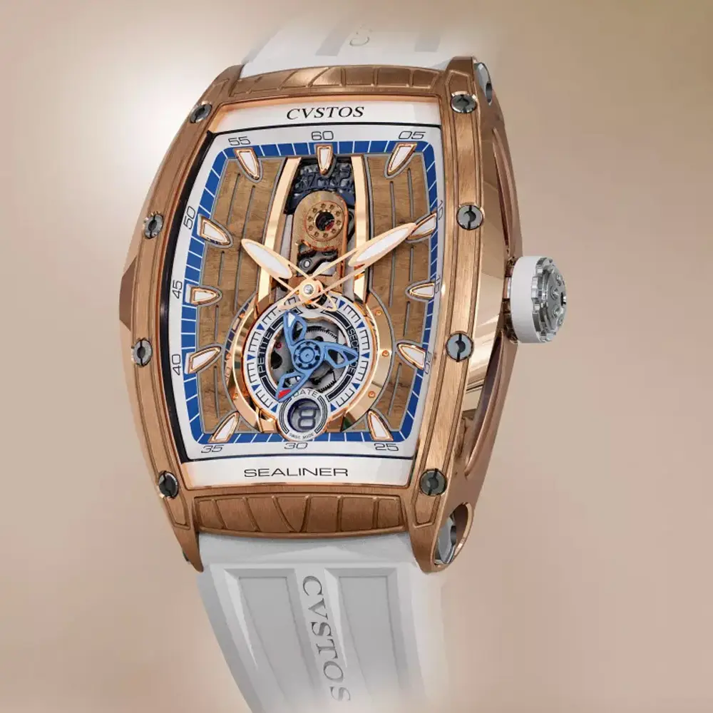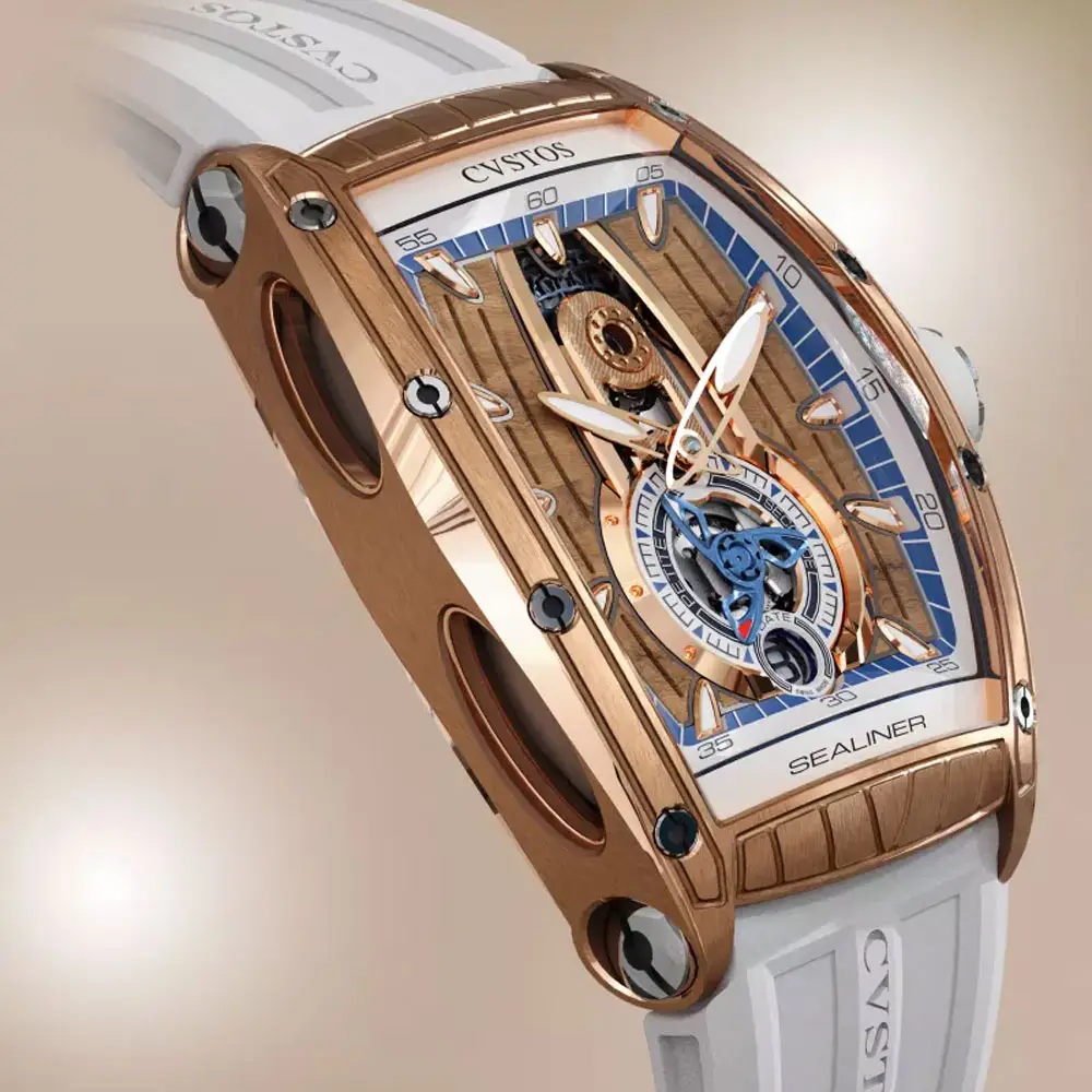 Die CVSTOS Sealiner PS Thirty6 5N Red Gold/Titanium vereint moderne Uhrmacherkunst mit maritimen Designelementen, die die Sealiner-Kollektion auszeichnen. Das 47,2 × 36 mm tonneauförmige Gehäuse besteht aus edlem 5N Roségold in Kombination mit Titanakzenten, die Robustheit und einen sportlichen Charakter verleihen. Das skelettierte „Sky Blue“-Zifferblatt gewährt Einblick in die faszinierende Mechanik und beeindruckt durch seine räumliche Tiefe, ergänzt durch lumineszierende Zeiger und Indizes.