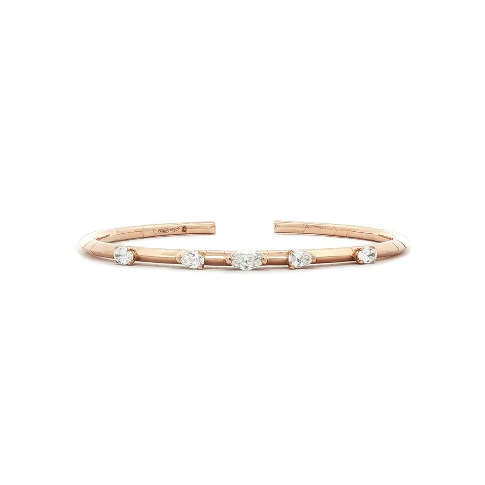 Dieser feste Armreif aus 18kt Roségold im Manschettenstil vereint dezenten Luxus mit modernem Design. Die schlichte Goldlinie ist mit fünf Diamanten in eleganten Schliffen – Oval, Marquise und Tropfen – besetzt, die ein faszinierendes Lichtspiel erzeugen.