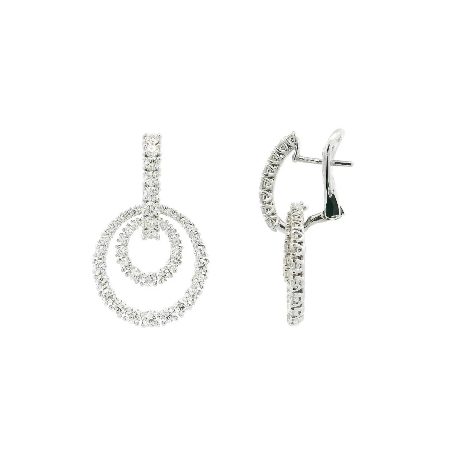 Diese luxuriösen Ohrringe aus Weißgold faszinieren mit einem architektonischen Doppelkreis-Design, das vollständig mit Brillantschliffen besetzt ist. Die feine Silhouette ermöglicht eine leichte Bewegung der Kreise und erzeugt ein faszinierendes Funkeln voller moderner Eleganz.