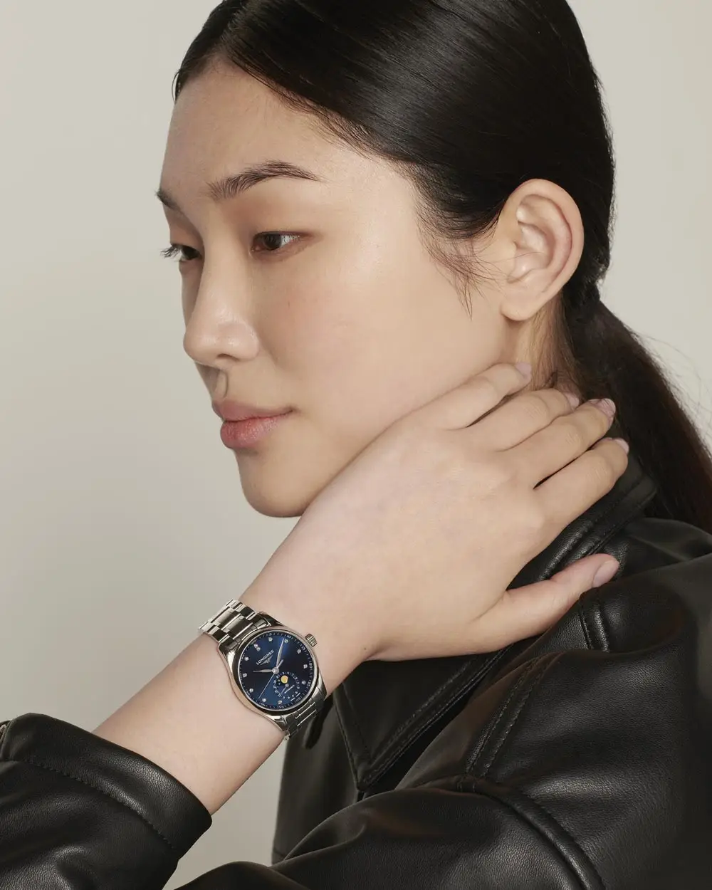 Das blaue Sunray-Zifferblatt ist mit 12 Diamantindizes (~0,055 ct) und silberfarbenen Zeigern versehen, die Lesbarkeit und Luxus vereinen. Bei 6 Uhr befindet sich ein Hilfszifferblatt mit Mondphasen- und Datumsanzeige.