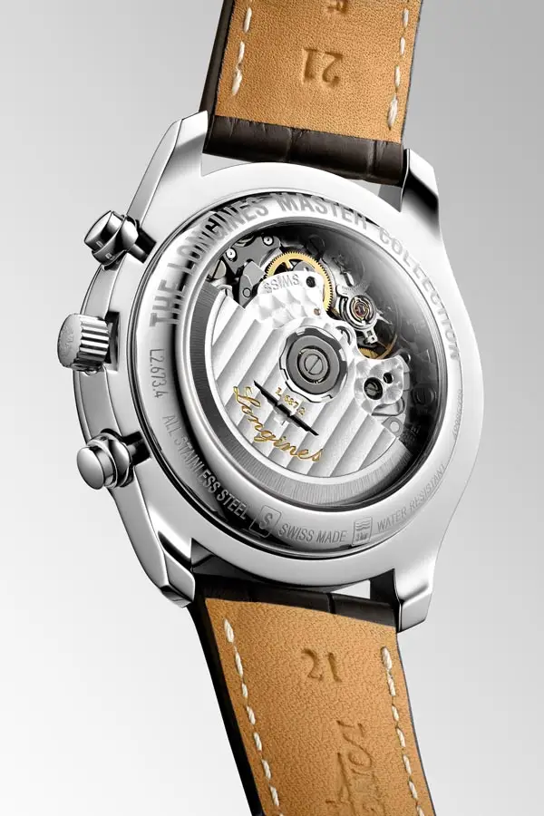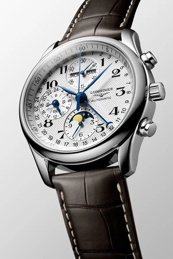 Das silberne analoge Zifferblatt ist meisterhaft gestaltet und beherbergt zahlreiche Komplikationen: Chronograph, Mondphase, Wochentag, Datum, Monat sowie eine zweite Zeitzone – ein echtes mechanisches Meisterwerk für Liebhaber präziser Zeitmessung. Das Hesalitglas verleiht der Uhr einen charmanten Vintage-Touch. Im Inneren arbeitet das automatische Kaliber L687 mit einer Frequenz von 28.800 Halbschwingungen pro Stunde und einer Gangreserve von bis zu 66 Stunden.