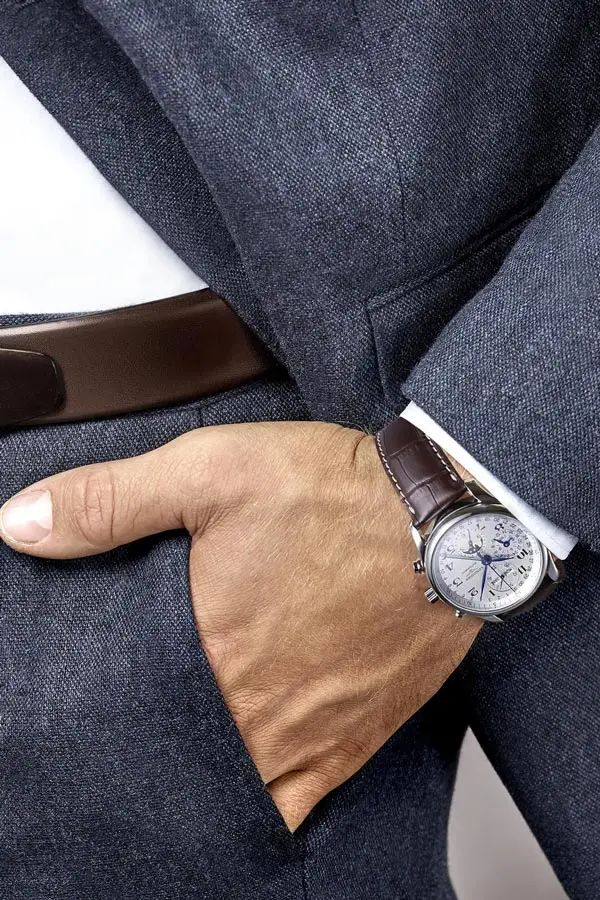 Ein braunes Alligatorlederband mit Faltschließe sorgt für hohen Tragekomfort und sicheren Halt. Mit einer Wasserdichtigkeit von 3 ATM / 30 Metern ist die Uhr vor alltäglicher Feuchtigkeit geschützt. Dieses Modell ist die perfekte Wahl für Herren, die traditionelle Uhrmacherkunst mit umfassender Funktionalität in stilvollem Design schätzen.