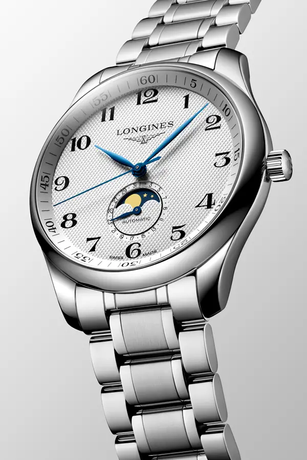 Das silberne „Barleycorn“-Zifferblatt ist mit arabischen Ziffern und gebläuten Zeigern versehen, die der Uhr einen raffinierten und eleganten Charakter verleihen. Bei 6 Uhr befindet sich ein Hilfszifferblatt, das Mondphase und Datum kombiniert und so Funktionalität und Attraktivität steigert.
