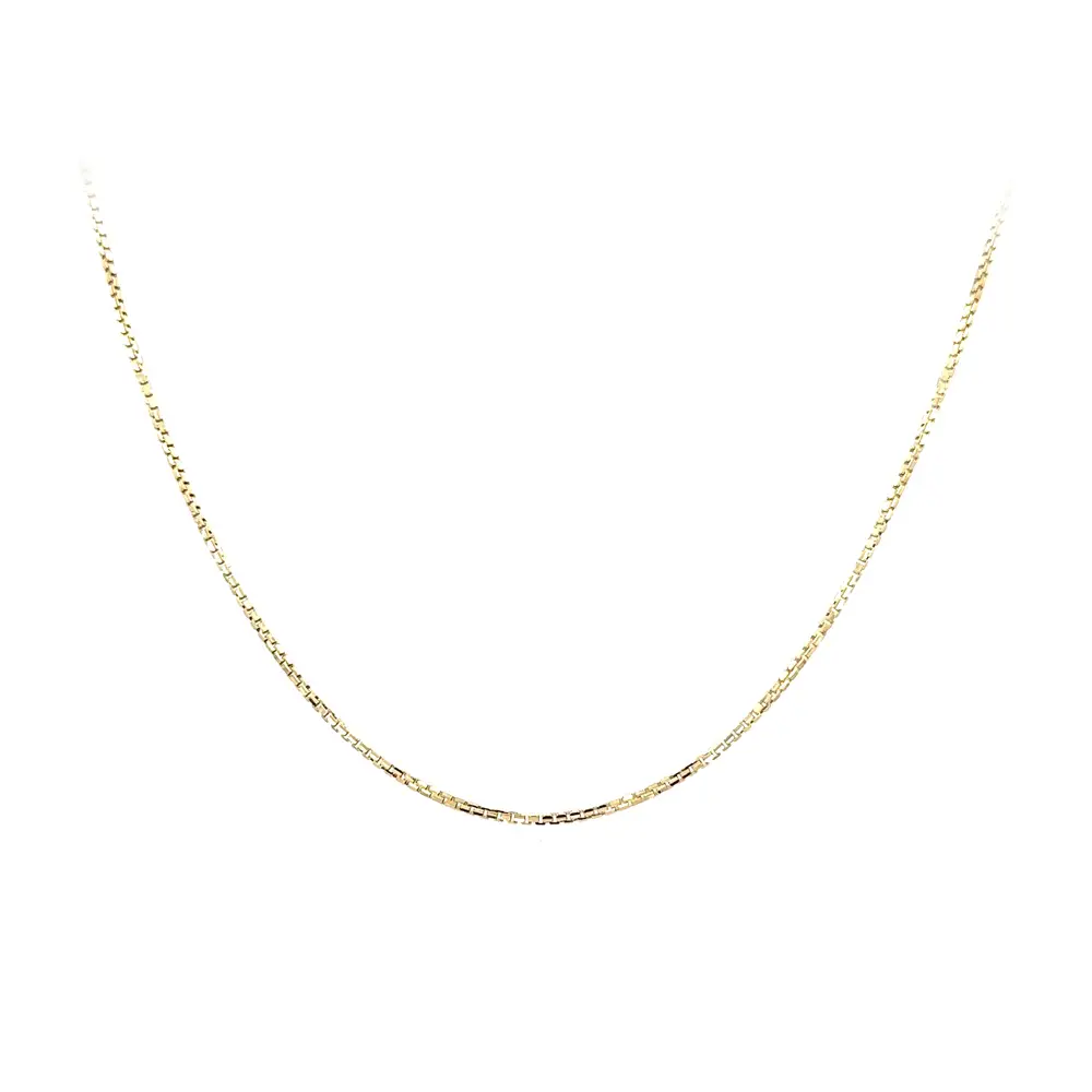 Die feine goldene Kette im Box-Muster überzeugt durch ihr klares und zeitloses Design und eignet sich ideal zum alleinigen Tragen oder in Kombination mit einem Anhänger. Präzise gearbeitete quadratische Box-Glieder sorgen für eine elegante, gleichmäßige Struktur mit dezentem Glanz und modernem Ausdruck.