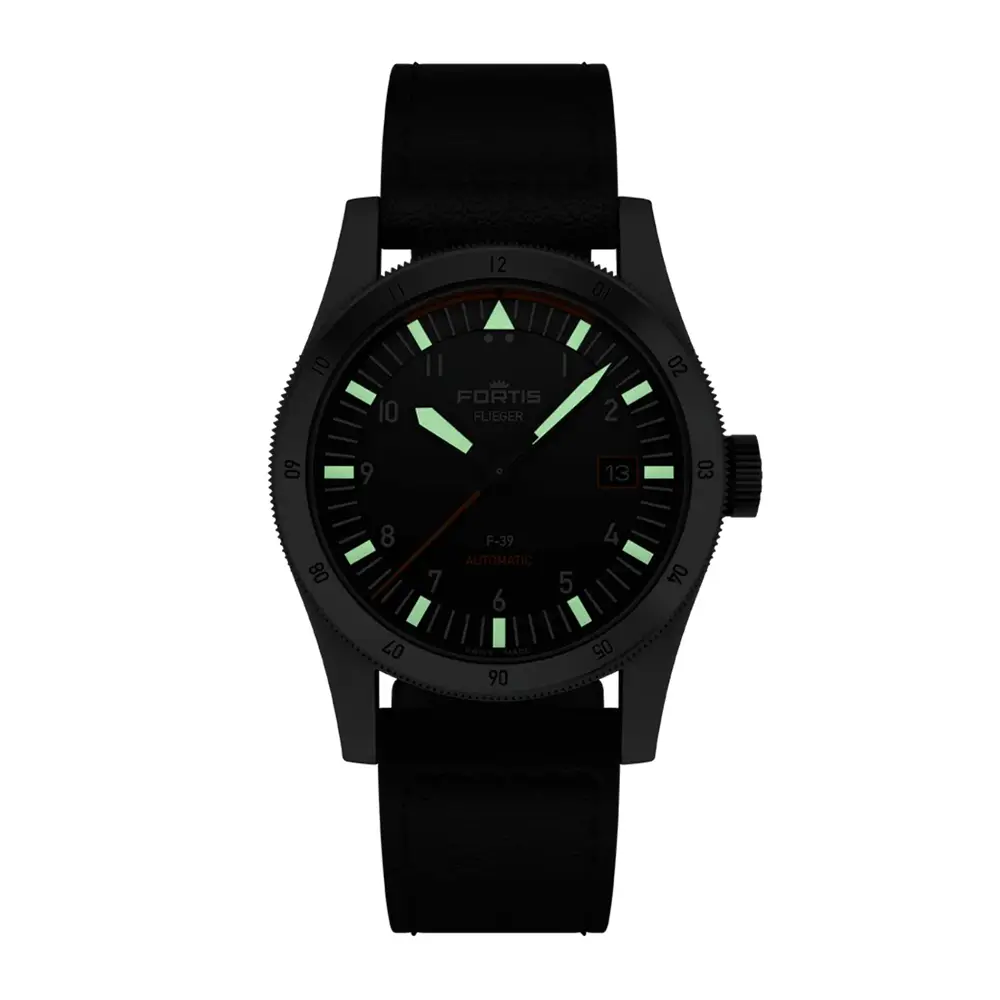 Im Inneren arbeitet das automatische Kaliber UW-30 mit einer Gangreserve von 38 Stunden. Das Aviator-Lederband sorgt für hohen Tragekomfort und betont den charakteristischen Fliegerstil. Die Fortis Flieger F-39 Automatic vereint Tradition, Leistung und Stil – perfekt für alle, die Präzision und Abenteuerlust schätzen.