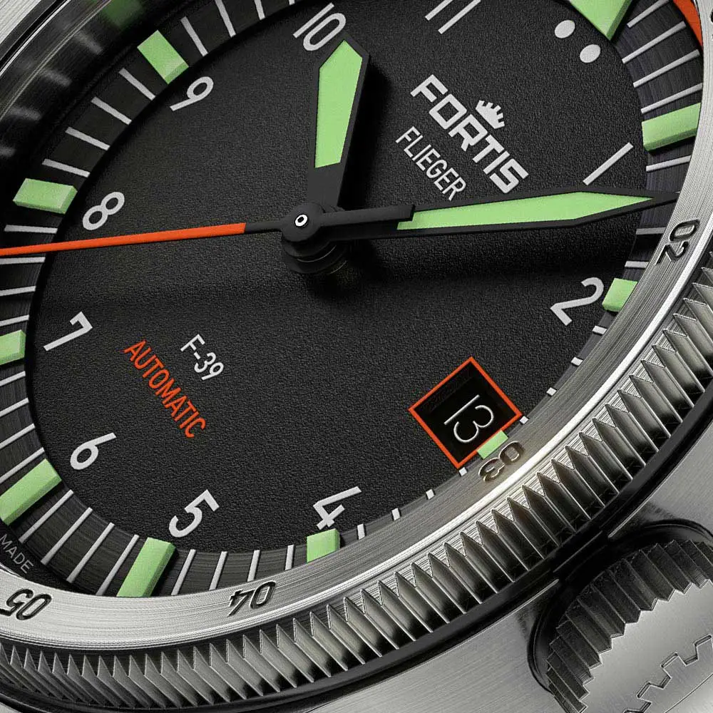 Das mattschwarze Zifferblatt mit markanten Zeigern und Super-LumiNova® X1 sorgt für perfekte Ablesbarkeit bei Tag und Nacht. Die drehbare 12-Stunden-Lünette ermöglicht das Verfolgen einer zweiten Zeitzone, und die orangefarbene Synchroline® dient der präzisen Zeitsynchronisation – Details, die das authentische Fliegererbe von Fortis widerspiegeln.