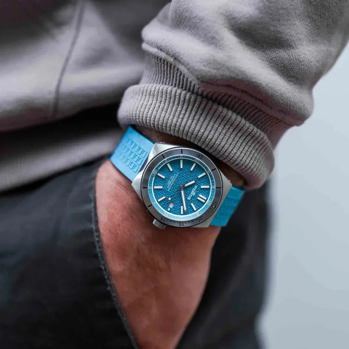 Dank der Wasserdichtigkeit von 30 ATM / 300 m, der verschraubten Krone und der robusten Bauweise eignet sich die Uhr auch für anspruchsvolle Bedingungen wie Tauchen. Ausgestattet mit einem Kautschukarmband oder Edelstahlarmband bietet sie hohen Tragekomfort.