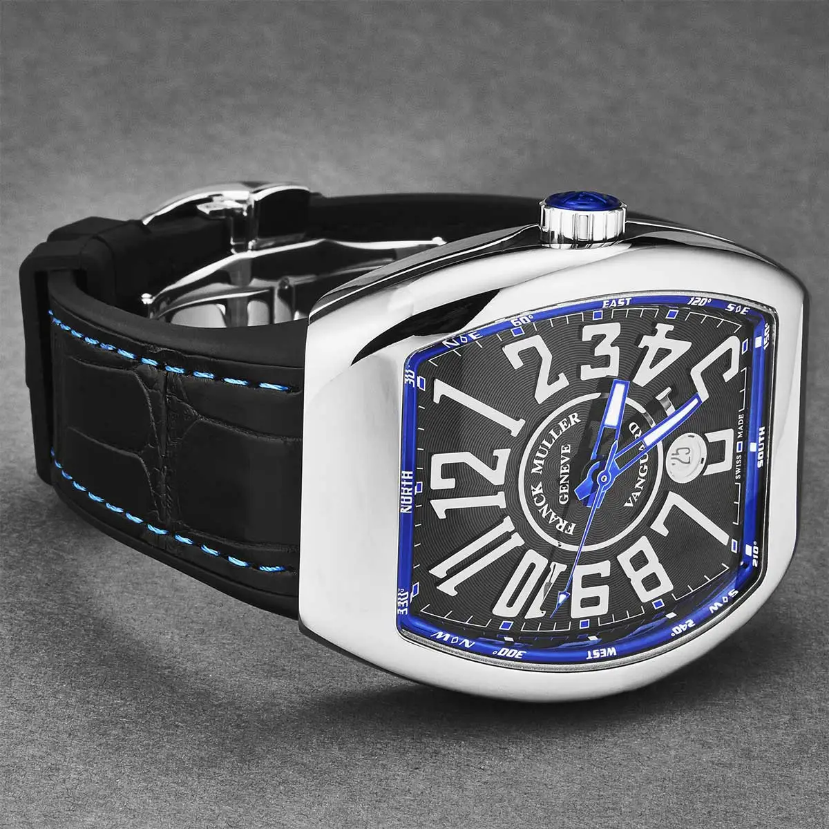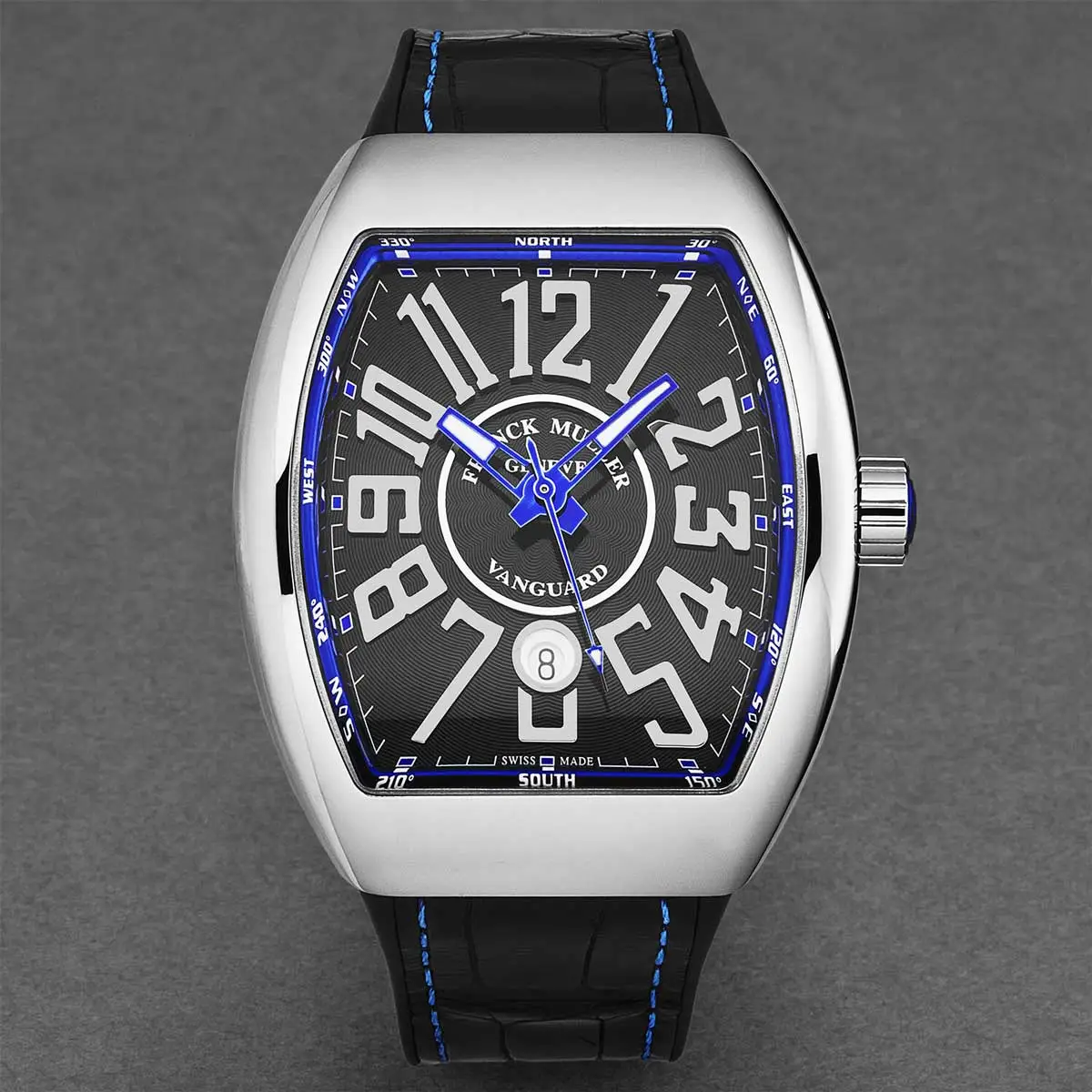 Vanguard ist die moderne und dynamische Kollektion von Franck Muller, die Sportlichkeit mit avantgardistischem Design verbindet. Sie zeichnet sich durch eine markante Tonneau-Silhouette, fließende Linien und ein robustes Gehäuse aus, das massiv, aber elegant und ergonomisch wirkt.