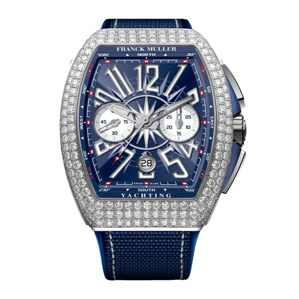 Der Vanguard Yachting Chronograph V 45 CC DT YACHT D (BL) zählt zu den ausdrucksstärksten, maritim inspirierten Interpretationen der Kollektion. Das blaue Zifferblatt mit Kompassrose und applizierten 3D-Ziffern schafft eine charakteristische Designsprache aus der Welt des Segelsports, während das diamantbesetzte Gehäuse das Modell in eine luxuriöse Sphäre hebt. Die Kombination aus Blau, Weiß und Stahltönen erzeugt einen sportlich-modernen und zugleich eleganten Gesamtausdruck.