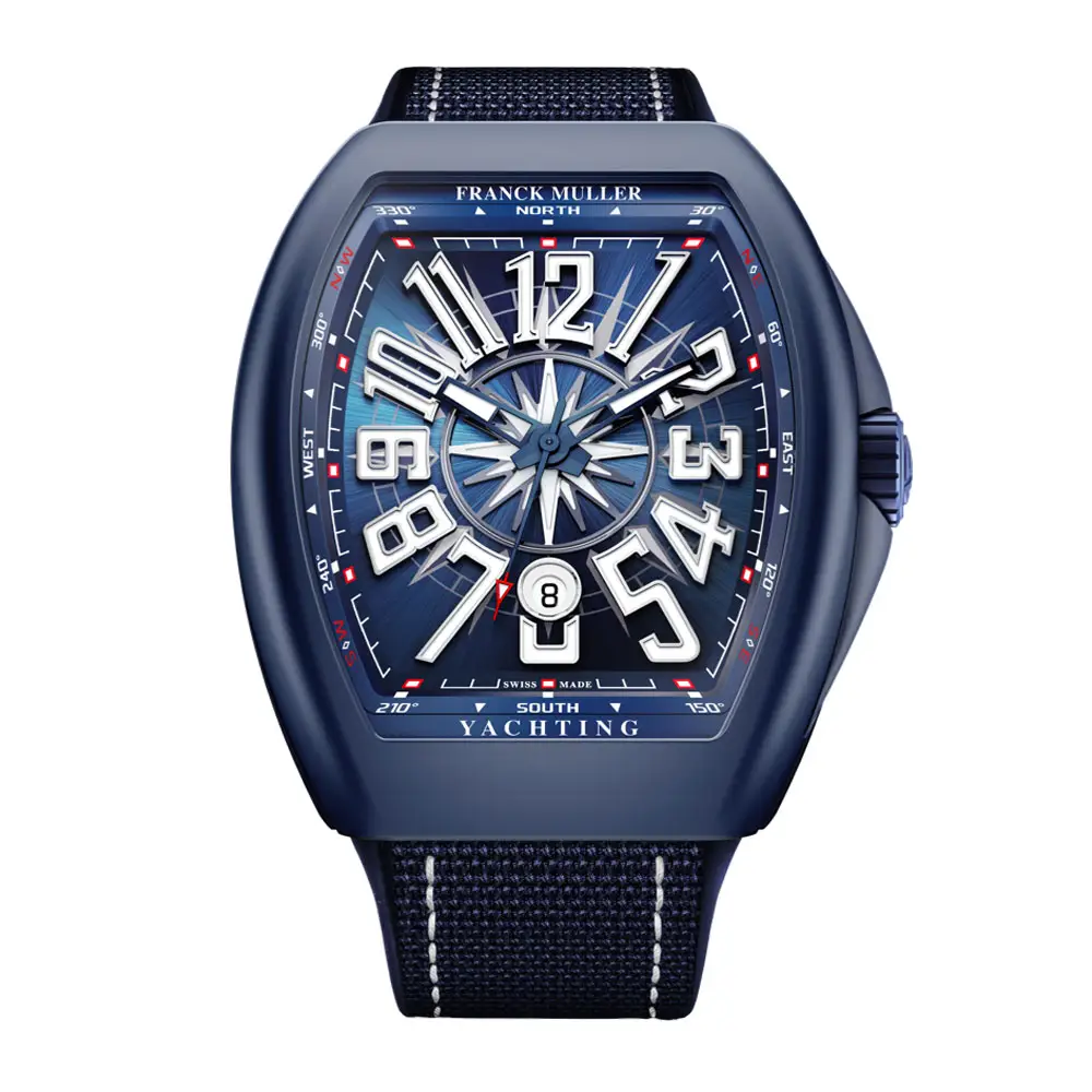 Die Kollektion Vanguard Yachting interpretiert die maritime Inspiration von Franck Muller durch Lichtspiele, Orientierung und dynamische Geometrie. Beim V 45 SC DT YACHT CR BL MC (BL) steht das blaue Zifferblatt mit Kompassrose im Mittelpunkt und verleiht der Uhr optische Tiefe sowie eine klare nautische Identität. Applizierte Ziffern im charakteristischen Typografiestil sorgen für markante Ablesbarkeit.
