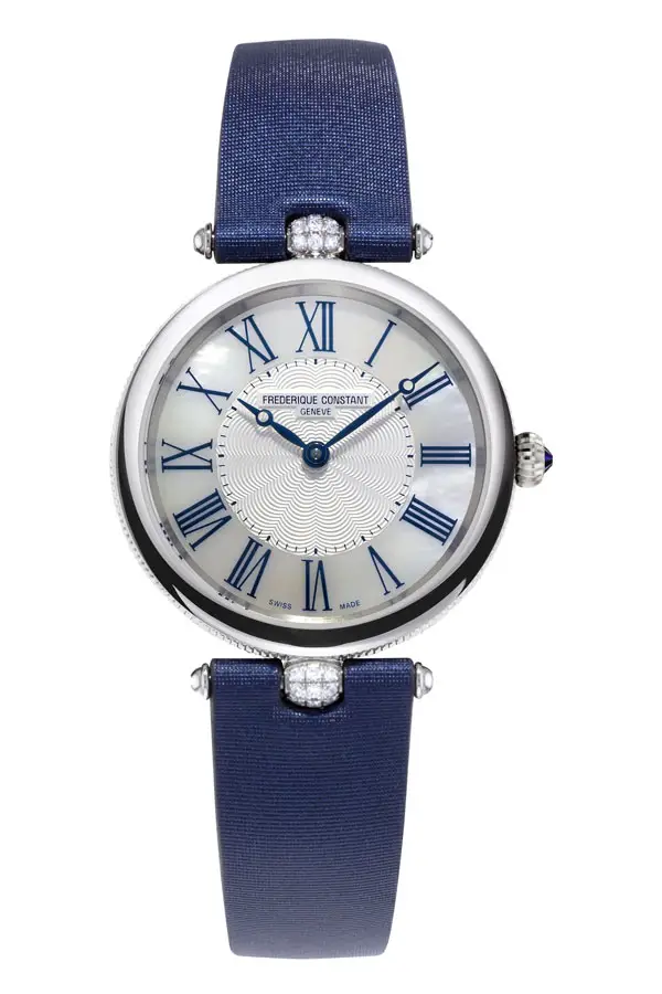 Die Frédérique Constant Art Deco Round FC-200MPWN2AR2D6 verkörpert klassische Eleganz und femininen Charme, inspiriert von der Art-déco-Ära. Ihr 30 mm großes rundes Edelstahlgehäuse wirkt zart und raffiniert, während das Saphirglas das weiße Zifferblatt mit markanten römischen Ziffern schützt, die den historischen Charakter des Modells betonen.