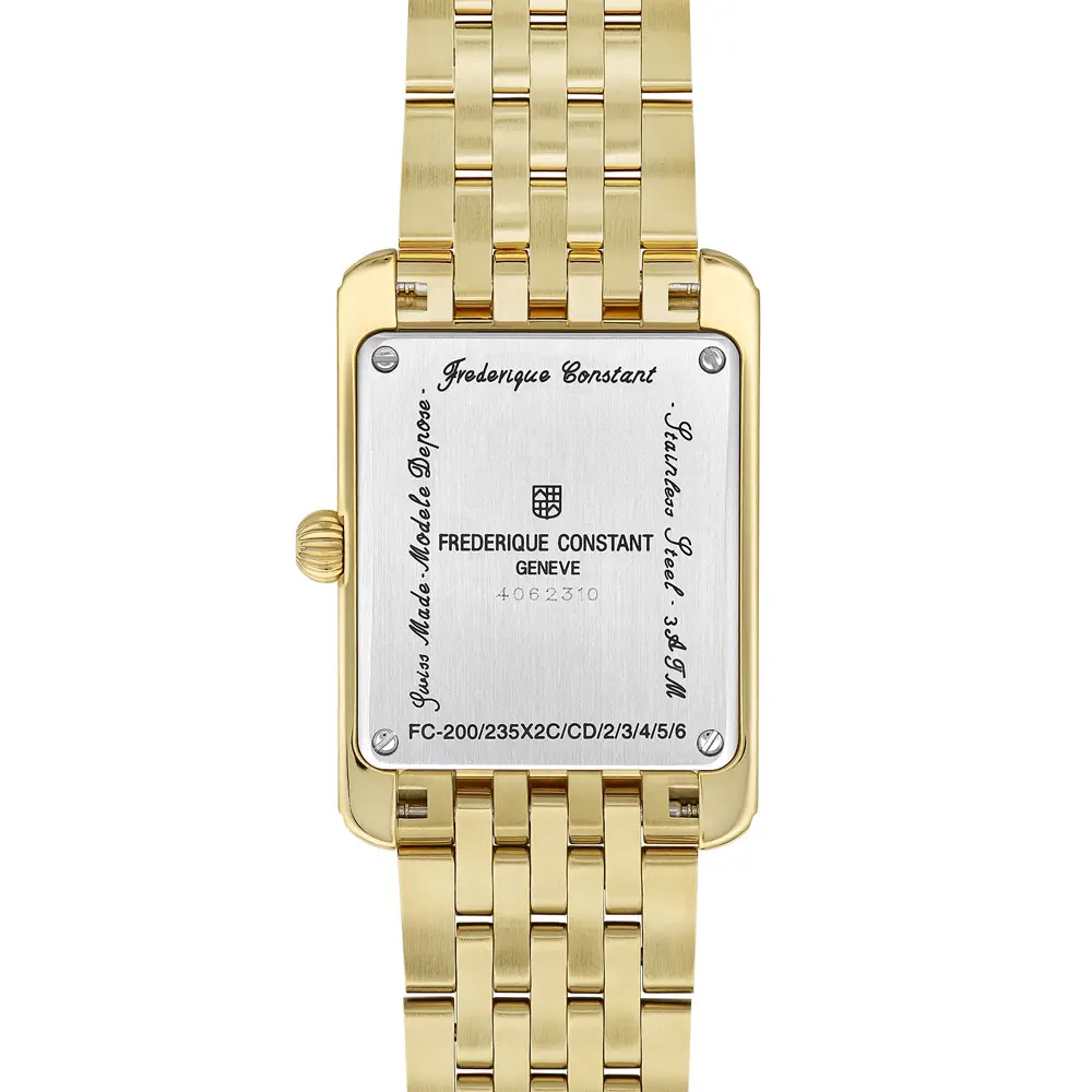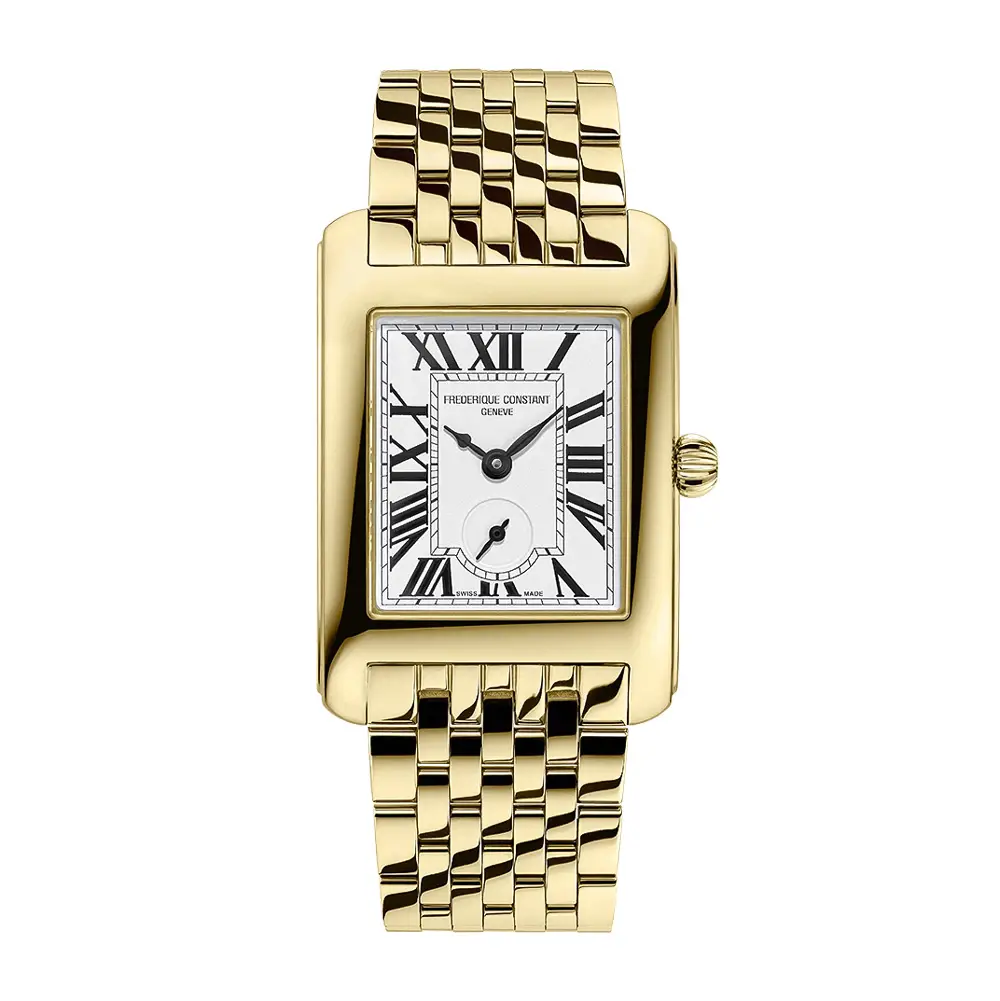 Die Frederique Constant Classics Carrée Small Seconds FC-235S2C5B interpretiert die Eleganz des Art-Déco-Stils in einem modernen Unisex-Format. Das rechteckige Gehäuse mit goldfarbener PVD-Beschichtung umrahmt ein silberfarbenes Zifferblatt mit römischen Ziffern, feinen Zeigern und einer kleinen Sekunde über der Sechs. Das Gesamtdesign wirkt zeitlos und harmonisch und eignet sich perfekt für den Alltag wie auch für formelle Anlässe.
