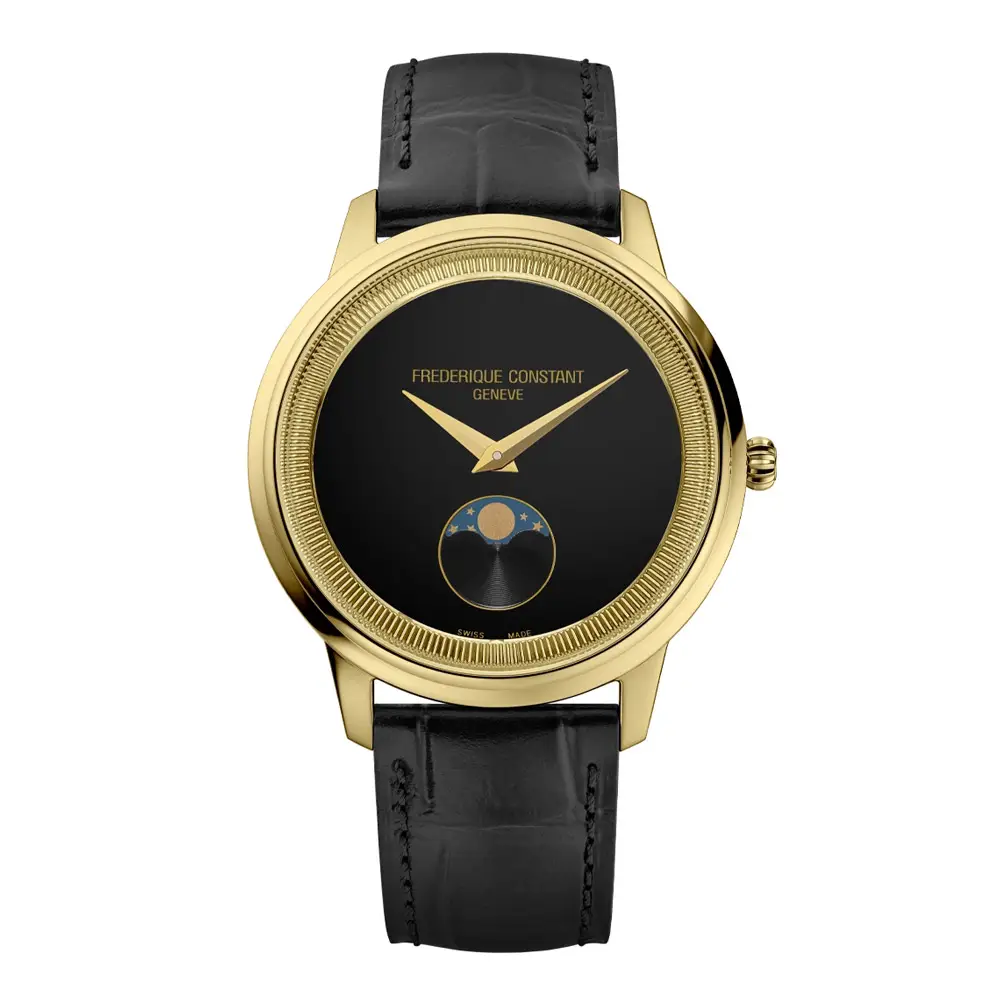 Die Frederique Constant Classics Moneta Moonphase FC-206B3S5 verkörpert zeitlose Eleganz und feine Schweizer Uhrmacherkunst. Das schwarze Zifferblatt im minimalistischen Stil bildet einen edlen Kontrast zum goldfarbenen Gehäuse, während die Mondphasenanzeige bei 6 Uhr dem Modell eine poetische Note verleiht. Ausgewogene Proportionen und klare Linien machen diese Uhr zu einem stilvollen Begleiter für Alltag und besondere Anlässe.