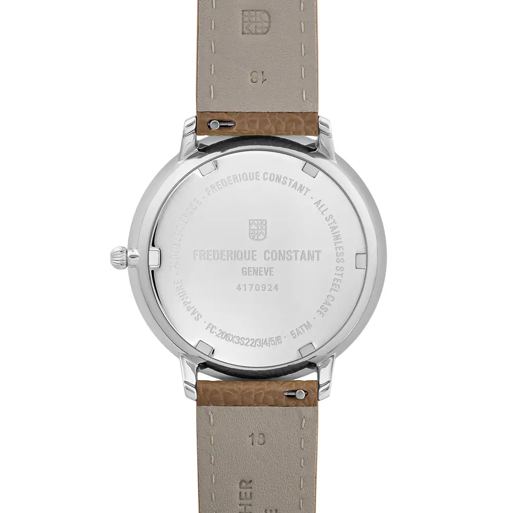 Im Inneren arbeitet das Schweizer Quarzwerk FC-206, das für Präzision und Zuverlässigkeit steht. Ein Lederarmband bietet hohen Tragekomfort, während die Wasserdichtigkeit von 5 ATM den Alltagseinsatz problemlos ermöglicht. Das Modell FC-206RN3S6 ist ideal für Liebhaber klassischer Uhren mit feiner Komplikation.