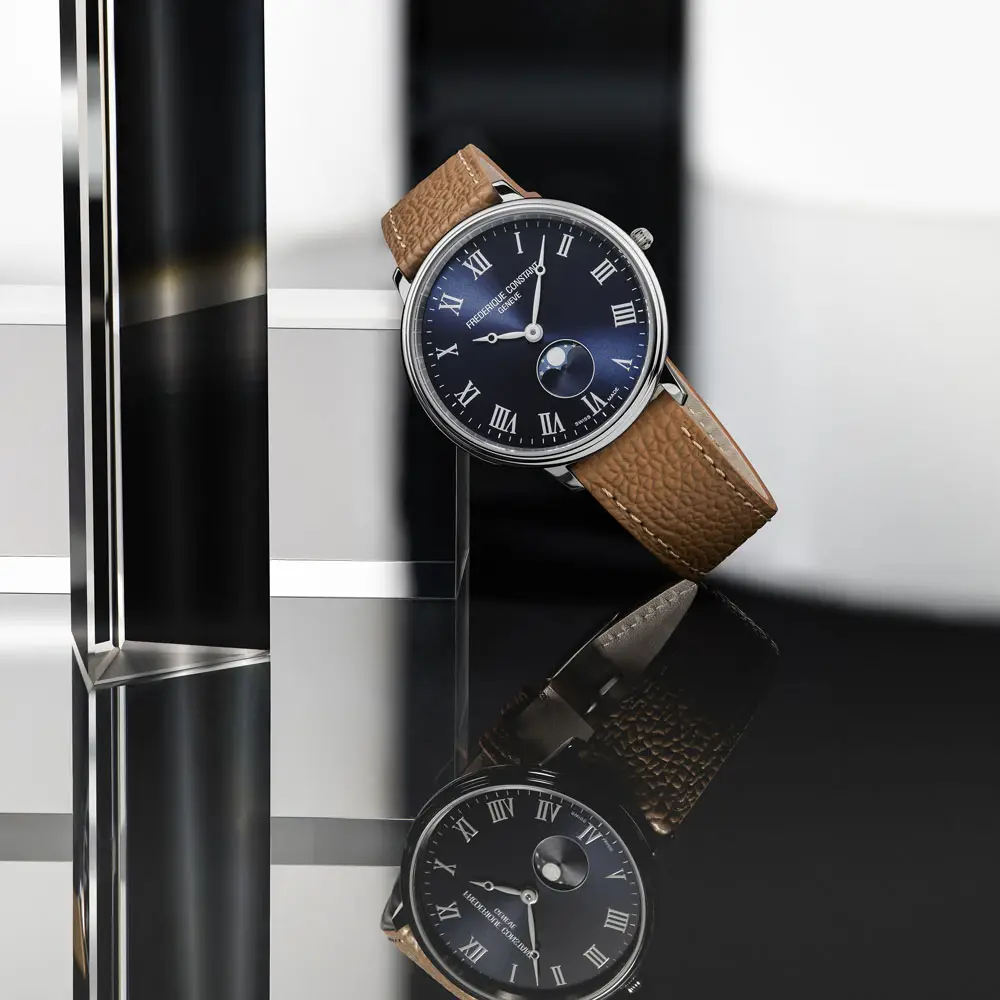 Die Frederique Constant Classics Quartz Moonphase vereint zeitlose Eleganz mit Schweizer Uhrmacherkunst. Das 39 mm große Edelstahlgehäuse überzeugt durch klassische Proportionen und eignet sich gleichermaßen für Damen und Herren. Das tiefblaue Zifferblatt mit feinem Glanz wird durch römische Ziffern ergänzt und unterstreicht den traditionsreichen Charakter der Uhr.