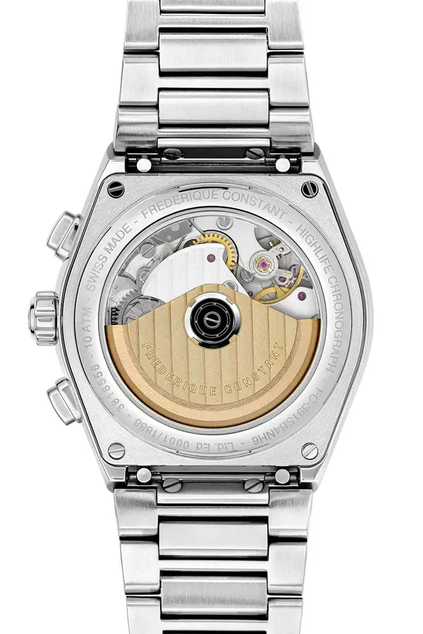 Im Inneren arbeitet das automatische Kaliber FC-391, das mit 28.800 Halbschwingungen pro Stunde läuft und eine Gangreserve von ca. 60 Stunden bietet. Der sichtbare Gehäuseboden erlaubt einen Blick auf das feine Uhrwerk.