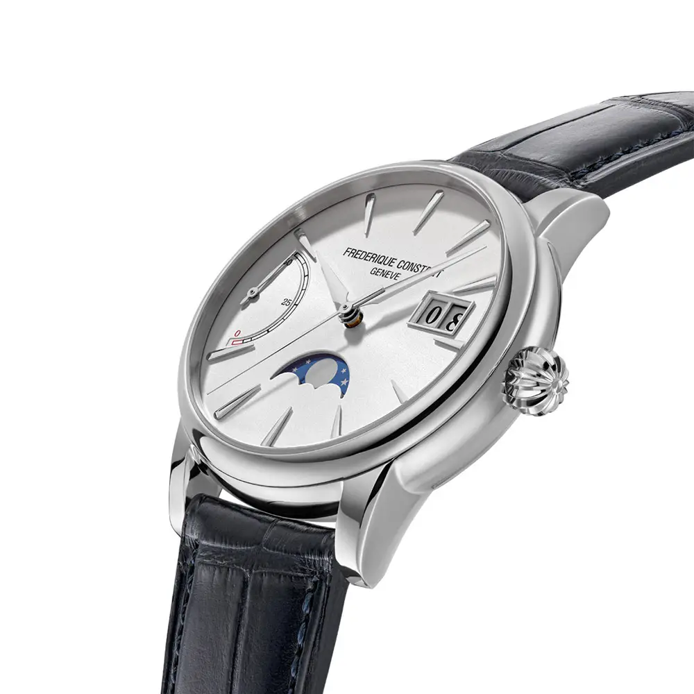 Frederique Constant FC-735S3H6 ist eine außergewöhnliche mechanische Uhr, die klassische Eleganz mit anspruchsvollen Komplikationen vereint, die Liebhaber feiner Schweizer Uhrmacherkunst schätzen. Das 40-mm-Edelstahlgehäuse umrahmt ein silbernes Zifferblatt, das Großdatum, Gangreserveanzeige und Mondphasenanzeige in einem harmonischen und zeitlosen Design präsentiert.